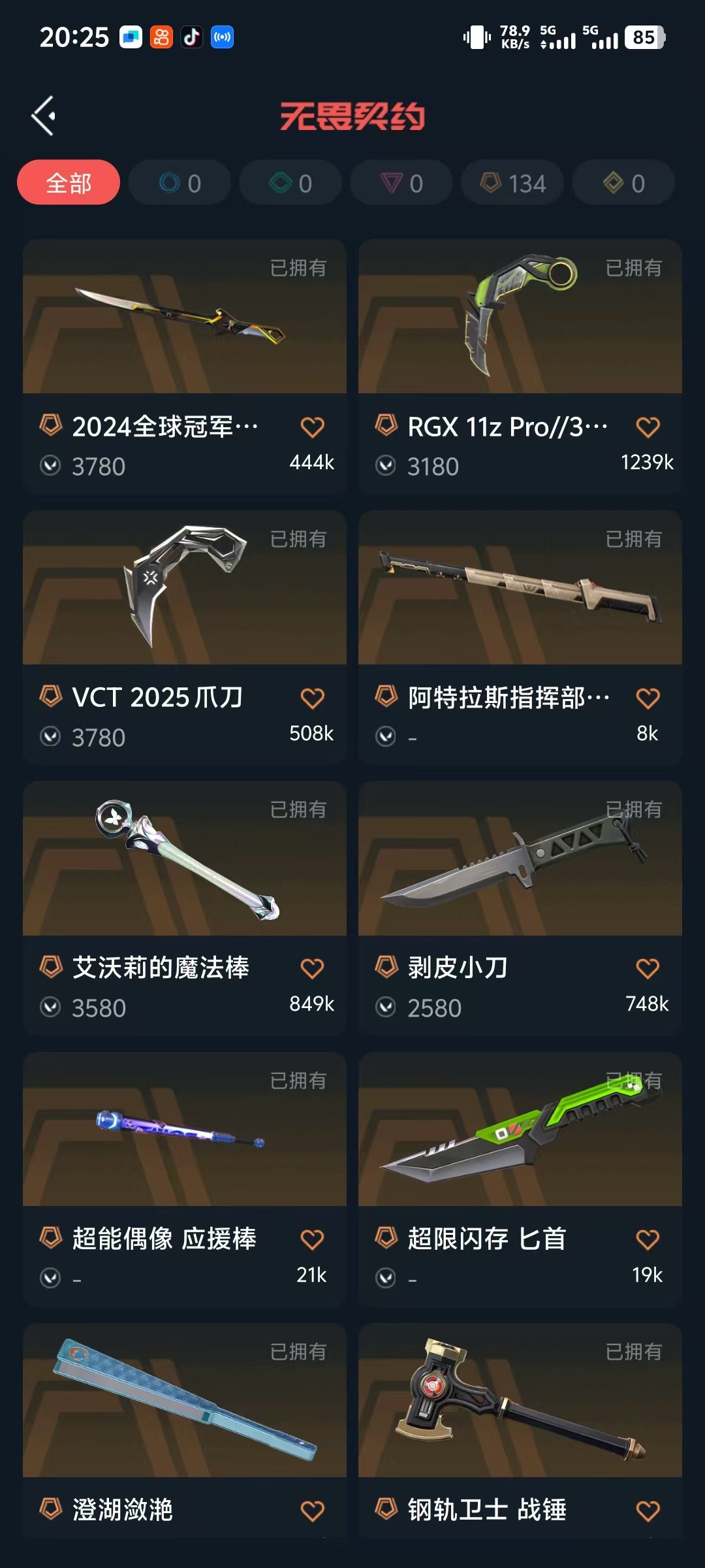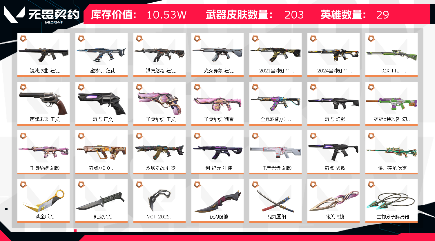 十万库存2124冠军;紫金爪刀,剥皮小刀,VCT 2025 爪刀,盖亚的复仇 狂徒,洪荒怒焰 狂徒,掠影 狂徒,侦察力量 幻影,