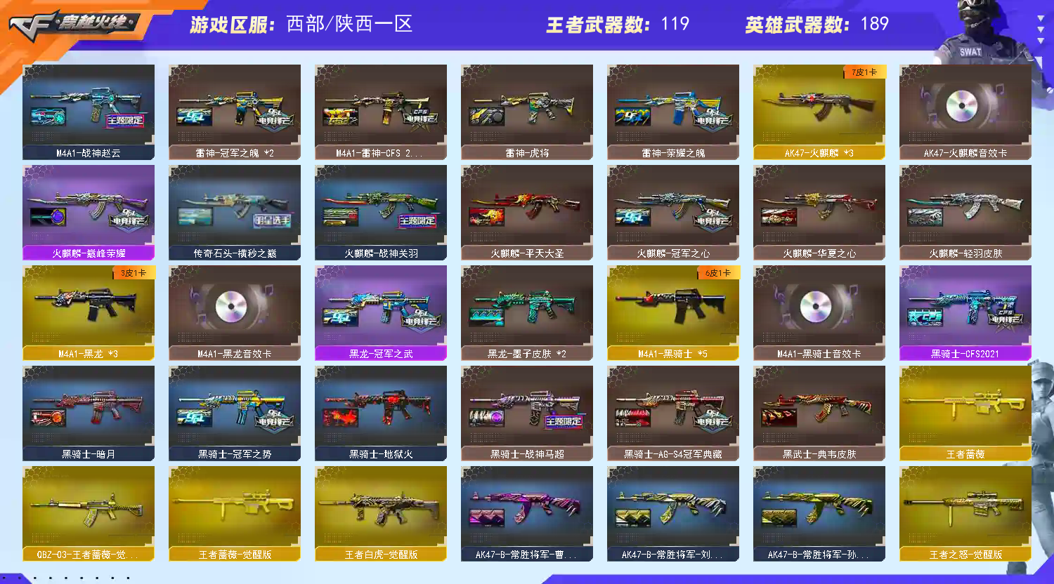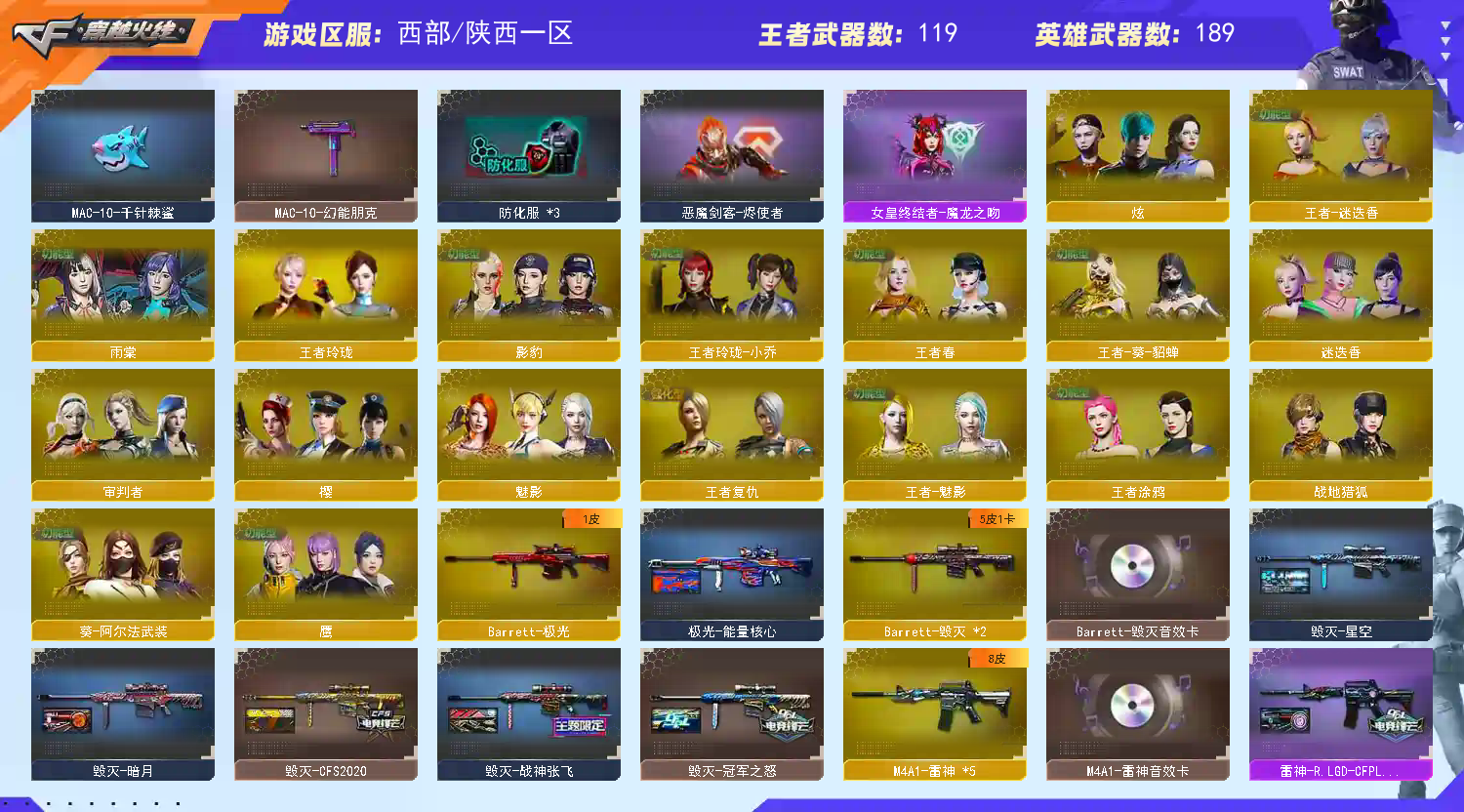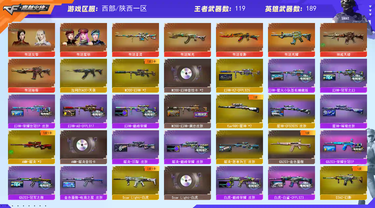 VVIP数量251 重要套装:堕天神套装/幻灵套装/荣耀世冠套装/雷霆王者套装, 重要角色:传说女帝/传说星骇/审判者/_樱/魅影/_炫/_迷迭香/_影豹/雨棠/鹰/荆棘/战地猎狐/幻面灵狐/王者复仇/王者零-传说之路/王者-葵-貂蝉/王者-魅影/王者玲珑/王者春/王者-迷迭香/王者玲珑-小乔/王者涂鸦/葵-阿尔法武装/修道士/龙儿-小淘气/代号:翼/铁扇公主/幽/职业选手/灵狐者-职业经理/莎莎/_炽天使/铁骑荣耀/零-水下丽影。 M200-幻神(2)/王者幻神-觉醒版(2) M200-幻神音效卡/HK417-朱雀音效卡/M4A1-雷神音效卡/M4A1-黑骑士音效卡/M4A1-黑龙音效卡/AK47-火麒麟音效卡/Barrett-毁灭音效卡/AWM-昌龙-怀旧音效卡/AWM-裁决音效卡/Barrett-碧霄极光音效卡/炼狱-百战金芒-庆典舞曲音效卡 蝴蝶刀 炼狱-奇幻宇宙万象+奇幻赋予卷+6盘6烈龙+斯泰尔蝴蝶+清道夫小人枪;USP-雷暴,柯尔特-无冕之王,USP-雷暴王者,荣耀世冠-柯尔特,柯尔特-冠军之特,炽芒蝶刃,传说星骇,
