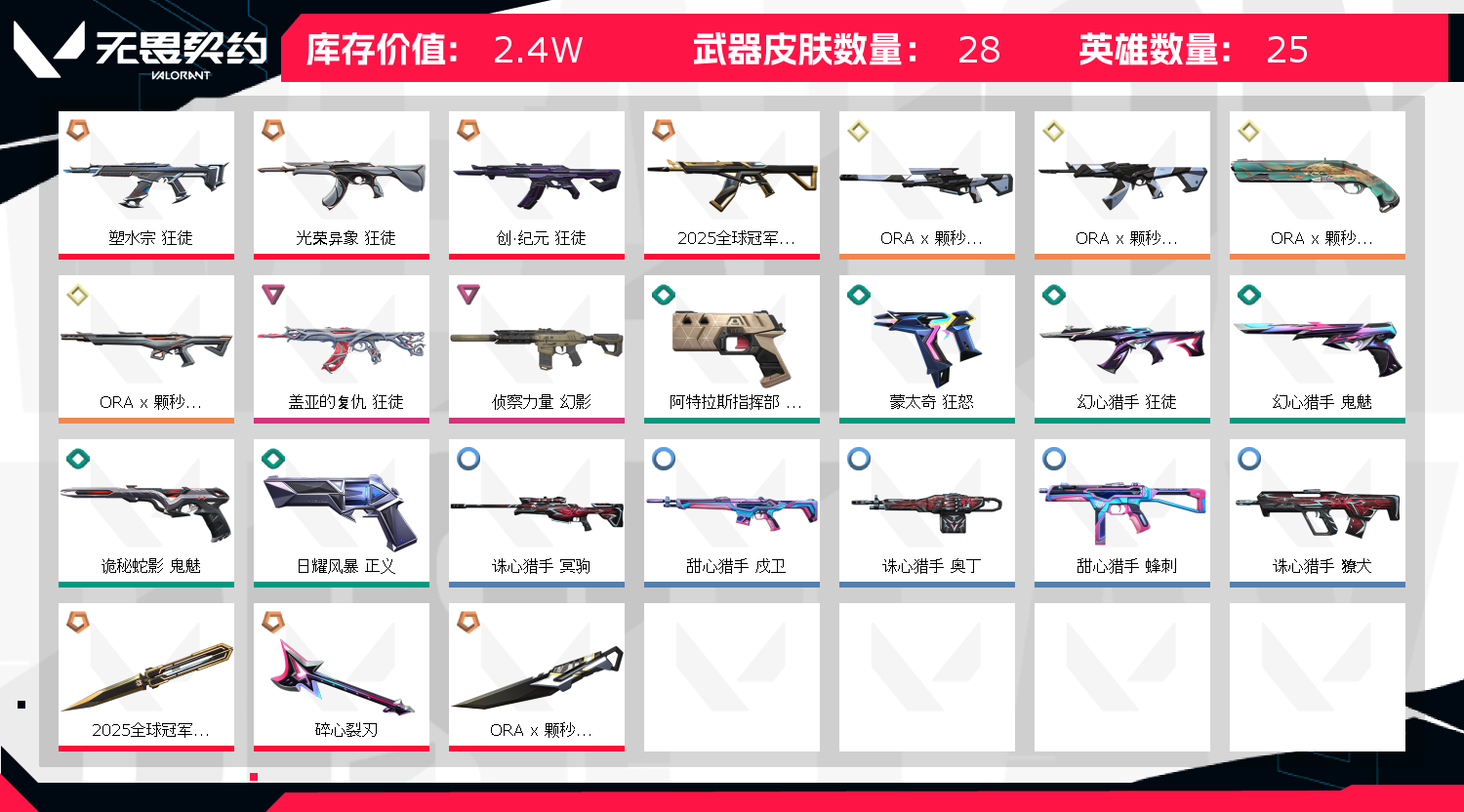 首页 > 租号大厅 > 无畏契约-wegame > wegame/wegame > 颗秒套装🔥25冠军套装🔥6把狂徒皮肤侦查幻影极品小号新套装!