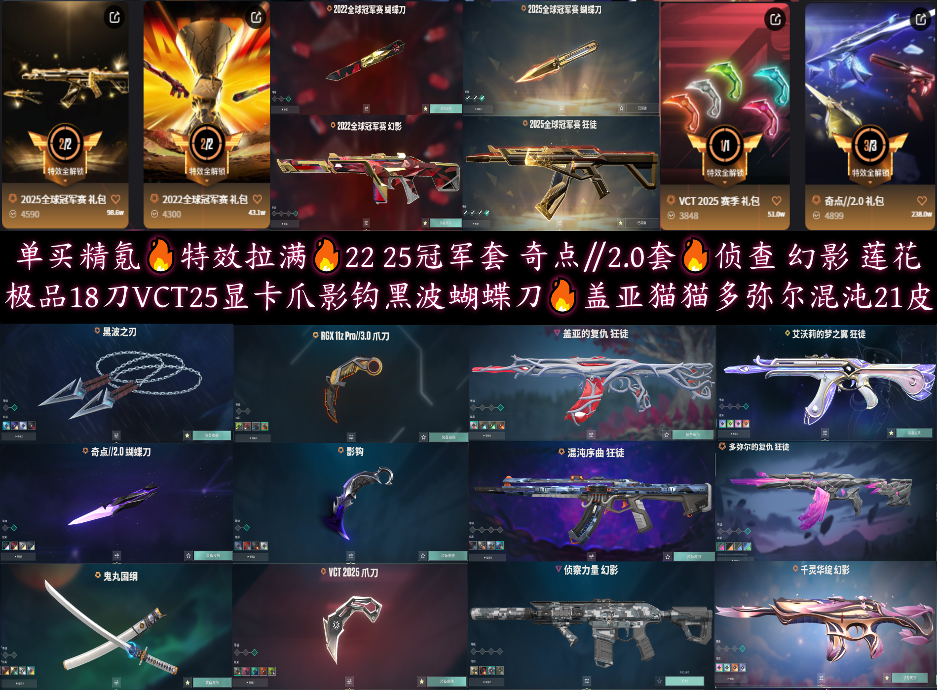 2225冠军套⚡精氪炫彩18刀VCT显卡影钩黑波之刃⚡盖亚多弥尔猫猫混沌紫金塑水流脓21皮⚡莲花侦查