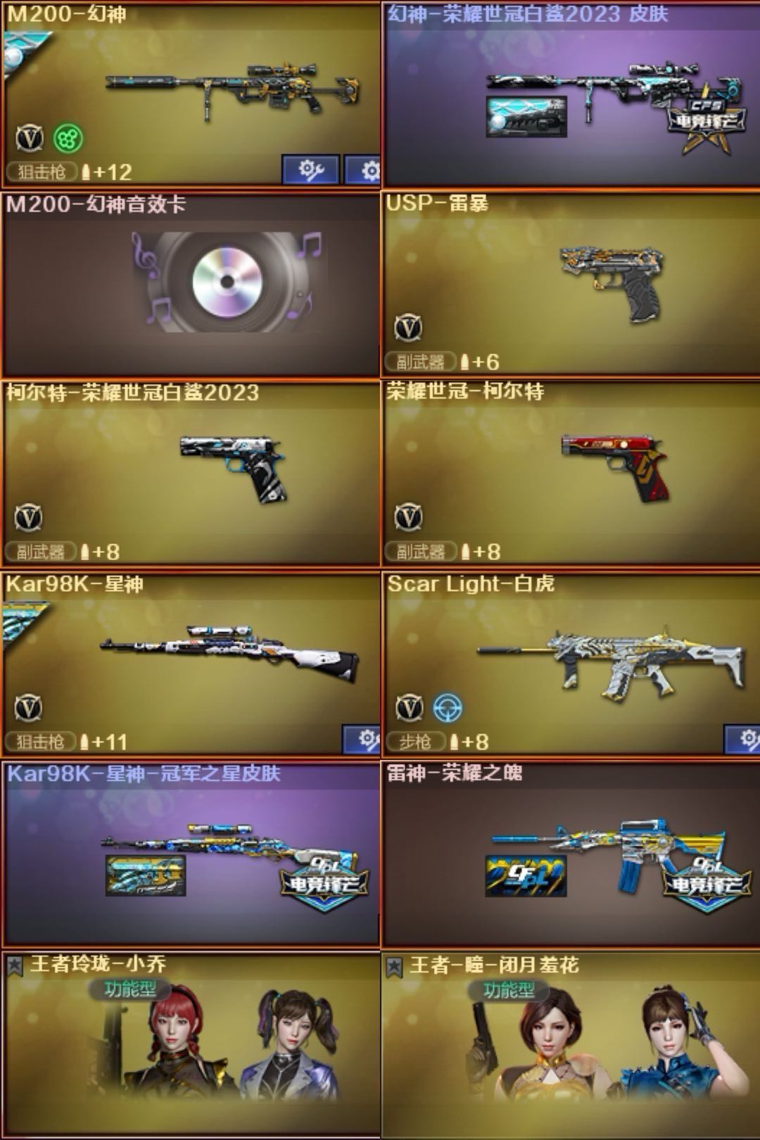 喜欢点点收藏吧;USP-雷暴,荣耀世冠-柯尔特,柯尔特-荣耀世冠白鲨2023,QBZ03-金色蔷薇,M200-幻神,Scar Light-白虎,Kar98K-星神,