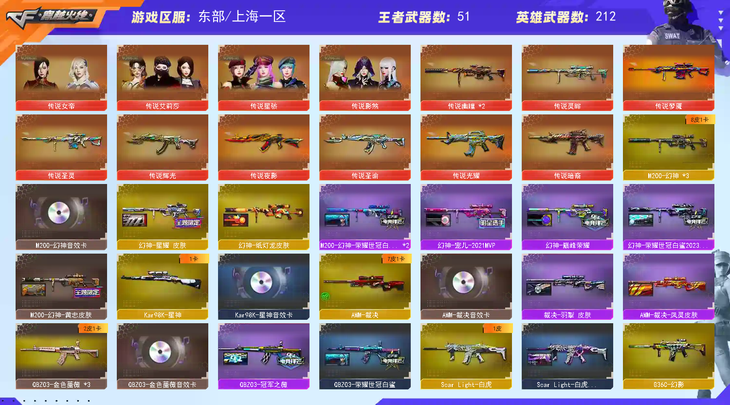 爆破套 | 生化套 | 挑战套都有 | 六盘六烈六炼狱+迷你小钢 人物:传说人物都有+鹰 | 隼 | 华 | 云悠悠 | 关小雨 | 晴雅 | 荒漠琉璃 | 凌霄 | 迷迭香 | 司雨 | 雨棠 | 王者炽天使 | 王者葵 | 王者小乔 | 王者貂蝉 | 王者影豹 | 王者潘多拉 武器:传说武器都有(手枪除外)两把幽瞳+王者风神 | 白虎 | 裁决 | 蔷薇 | 星神 | 毁灭+音效卡+10皮 | USP冥王 | 冠军之特+2 | 各种人物枪动物枪,看图吧;