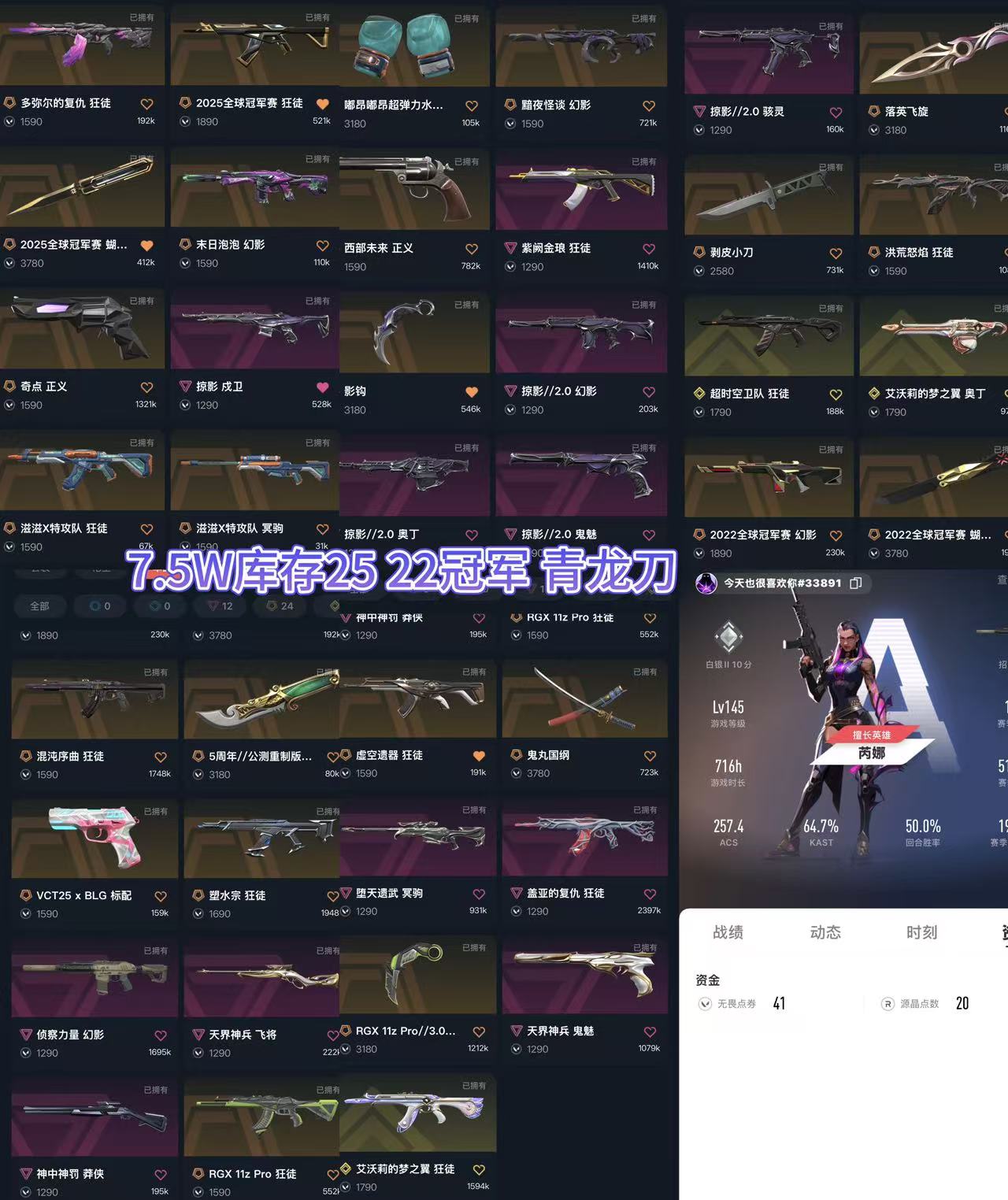 🔥8W 库存 25 22 冠军 青龙刀🔥可排❤️多弥尔的复仇 AK❤️2025 全球冠军赛 AK❤️黯夜怪谈 M4❤️掠影 //2.0 骇灵❤️落英飞旋❤️2025 全球冠军赛 蝴蝶刀❤️末日泡泡 M4❤️西部未来 正义❤️紫阙金琅 AK❤️剥皮小刀❤️流脓 AK❤️奇点 正义❤️掠影 戍卫❤️影钩❤️掠影 //2.0 M4❤️超时空卫队 AK❤️猫猫(艾沃莉的梦之翼)奥丁❤️滋滋 X 特攻队 AK / 冥驹❤️掠影 //2.0 奥丁 / 鬼魅❤️2022 全球冠军赛 M4❤️2022 全球冠军赛 蝴蝶刀❤️混沌序曲 AK❤️5 周年 // 公测重制版…❤️虚无 AK❤️鬼丸国纲❤️VCT25 x BLG 标配❤️塑水宗 AK❤️堕天遗武 冥驹❤️盖亚 AK❤️侦察力量 M4❤️天界神兵 飞将❤️显卡 Pro/3.0…❤️天界神兵 鬼魅❤️神中神罚 莽侠❤️显卡 AK❤️猫猫(艾沃莉的梦之翼)AK;艾沃莉的梦之翼 奥丁,5周年//公测重制版 苍龙之刃,剥皮小刀,盖亚的复仇 狂徒,虚空遗器 狂徒,掠影 戍卫,洪荒怒焰 狂徒,