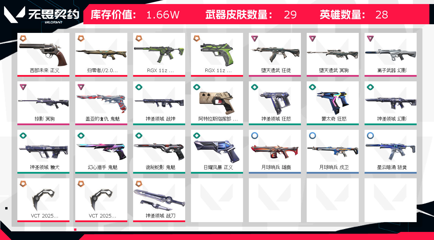 宝妈在家出租账号赚点奶粉钱,希望大家好好对待它,收着点打不要超过25杀,不要封禁了哦~ 低段位号容易封,望大家理解,我和我的孩子感谢大家了❤️❤️❤️;VCT 2025 爪刀,堕天遗武 狂徒,堕天遗武 冥驹,西部未来 正义,
