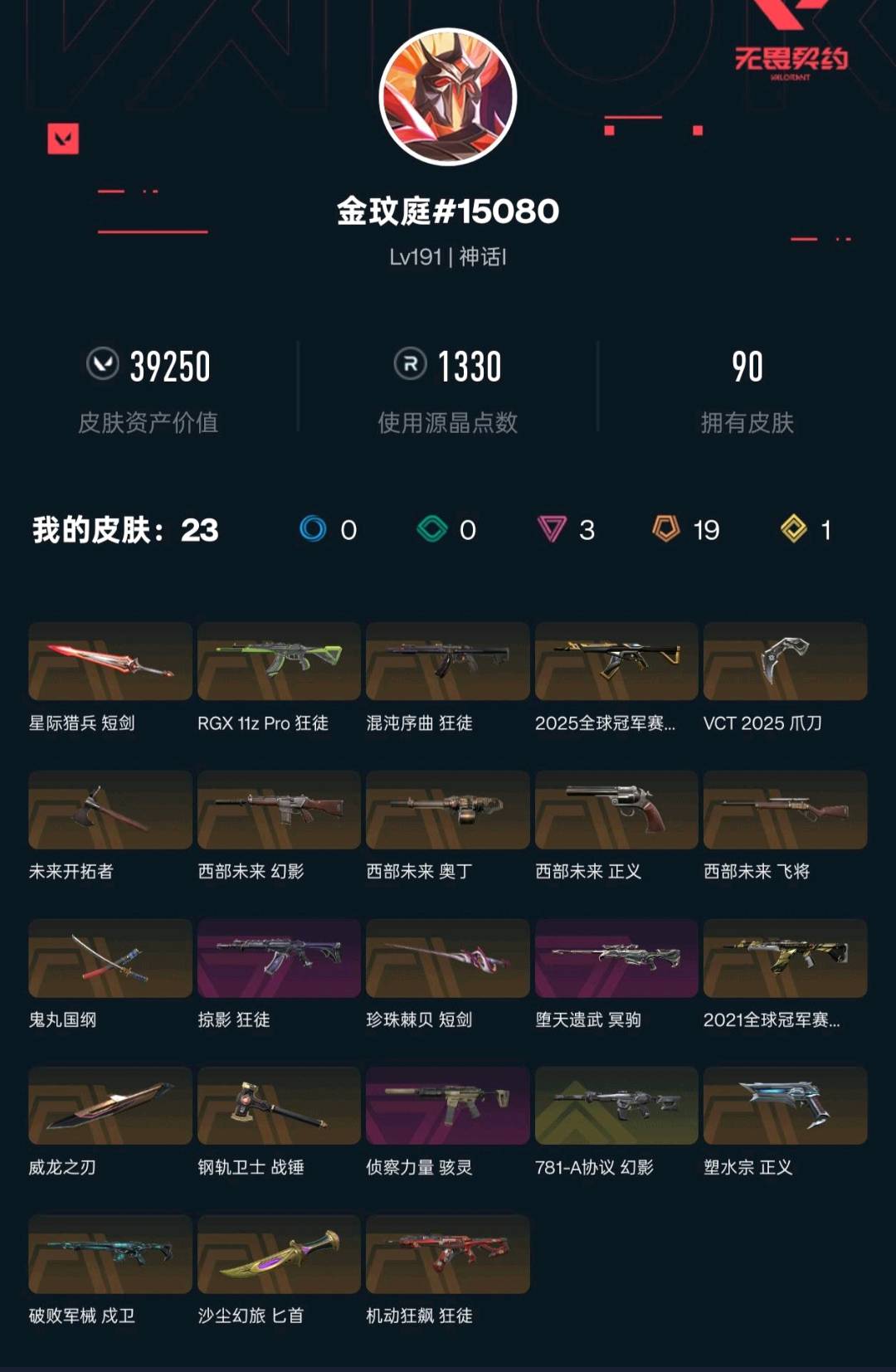 多赛季超凡神话21冠/混沌/显卡/25冠/掠夺/摩托/781/西部/鬼丸国纲/威龙/西部斧/vct爪 全英雄 可排位 不可改名骂人禁言;西部未来 奥丁,威龙之刃,VCT 2025 爪刀,掠影 狂徒,RGX 11z Pro 狂徒,混沌序曲 狂徒,2021全球冠军赛 狂徒,