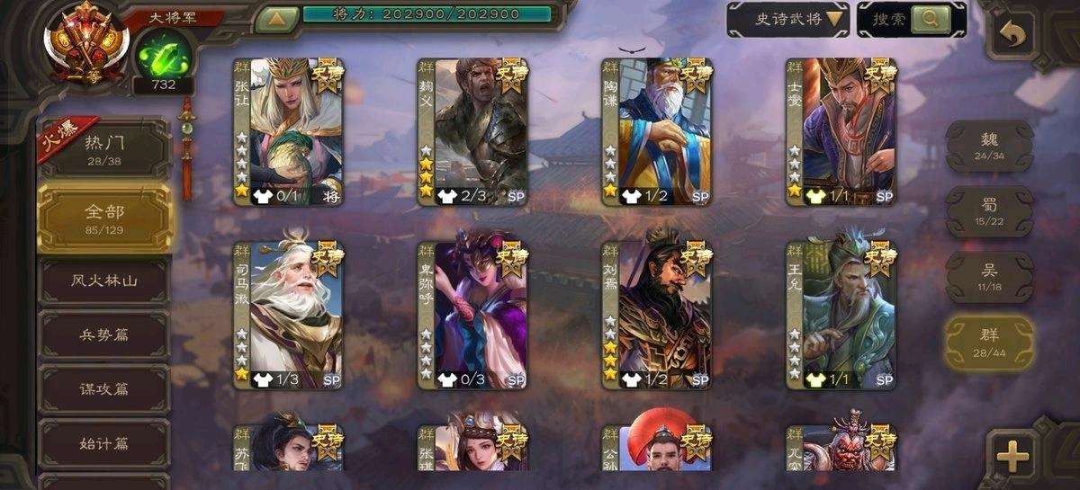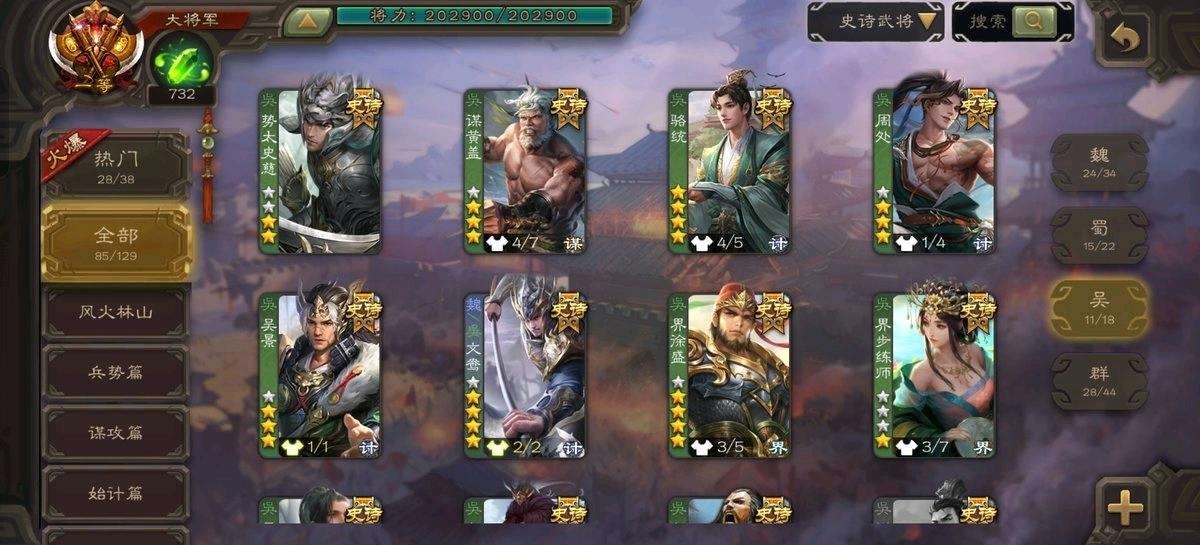 【VIP等级]VIP15[官阶]大将军【游戏等级]220【史诗武将数量]85【所有武将数量】482【所有皮肤数量]594【动态皮肤数量】78 【武将】神郭嘉神司马懿神曹操神甘宁神太史慈曹髦羊徽瑜司马昭马钧刘焉文鸯王元姬曹婴清河公主势太史慈谋黄盖谋张角界左慈杨彪裴秀庞德公南华老仙星董卓 【动态皮肤】擒虎拿蛟,霜刃绚练,重张区宇,玄天通冥,牛年七夕·孙权,逐鹿天下,苍天已死,龙年端午·张昌蒲,竭战鳞伤,安民护祚·费祎,气荡山河,牛年立冬·张春华,万人辟易,明良千古·诸葛亮,鼠年七