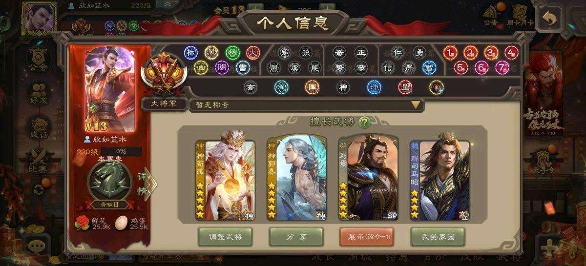 【VIP等级】VIP13[官阶]一等大将军【游戏等级]220【史诗武将数量】78【所有武将数量】445【所有皮肤数量]496【动态皮肤数量]68 【武将】动态神荀彧神郭嘉刘焉司马昭神甘宁谋黄盖谋公孙瓒审配星董卓庞德公南华老仙卑弥呼杜预刘璋界左慈张让谋黄忠关索星周不疑马钧…… 【动态皮肤】鼠年中秋·关银屏,联刘抗曹,超脱于世,鼠年冬至·SP司马昭,驱虎吞狼,傲睨万物,鼠年春节·辛宪英,墨点江山,龙吟破竹·杜预,牛年清明·甄姬,扬刀立威,星流霆击·孙尚香,万人辟易,烟水悠悠,虎年