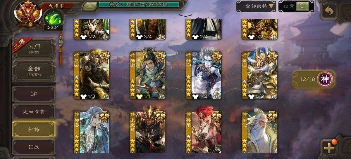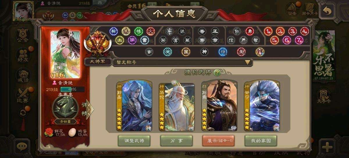 【VIP等级】VIP16[官阶]一等大将军【游戏等级]220【史诗武将数量】81【所有武将数量】459【所有皮肤数量]562【动态皮肤数量]113 【武将】回廊神郭嘉神华佗神孙策神甘宁曹髦司马昭刘焉羊徽瑜谋刘备谋诸葛亮谋黄忠王元姬马钧文鸯界徐盛界左慈审配祢衡南华老仙星董卓谋夏侯氏鲍三娘…… 【动态皮肤】破军杀将,鼠年端午·杨修,鼠年冬至·王元姬,蛇年端午·鲁肃,永开吴祚,兔年春节·关银屏,绽焰摧枯,西凉雄狮·马超,万人辟易,兼资文武,柳娇桃艳,明良千古·黄忠,锋芒毕露,龙年限