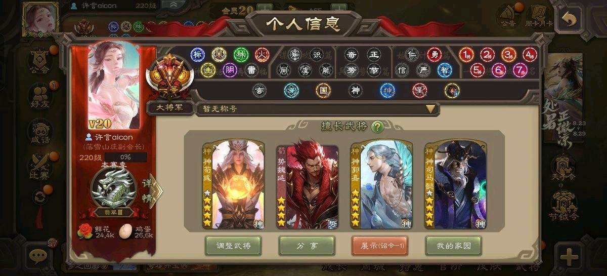 【VIP等级】VIP20[官阶]一等大将军【游戏等级]220【史诗武将数量】92【所有武将数量】477【所有皮肤数量]650【动态皮肤数量]125 【武将】神荀彧势魏延神郭嘉刘焉神鲁肃神司马懿神孙策神太史慈曹髦司马昭马钧回廊文鸯杜预回廊界钟会谋诸葛亮谋黄忠鲍三娘孙寒华大宝徐荣杨彪祢衡裴秀星董卓审配…… 【动态皮肤]鹰视狼顾·司马懿,墨点江山·郭嘉,驱虎吞狼·荀彧,猪年端午·曹丕,牛年清明·曹丕,气荡山河·曹丕,神兵天降·邓艾,独秉固志·王基,威严毅重·谋于禁,笔翰如流·王粲,