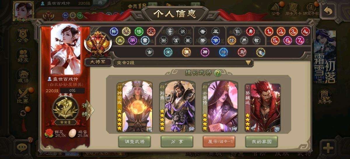 【VIP等级】VIP18[官阶]一等大将军【游戏等级]220【史诗武将数量】112【所有武将数量】521【所有皮肤数量]757【动态皮肤数量]154 【武将】回廊刘焉至臻十常侍至臻神郭嘉回廊神荀彧回廊神甘宁神鲁肃神华佗神曹操神孙策神太史慈势魏延友诸葛谋诸葛谋曹丕谋关羽鲍三娘势董昭回廊文鸯曹髦羊徽瑜蒋干司马昭傅佥势太史慈势陆郁生谋黄盖谋陆逊张奋势于吉回廊杜预谋貂蝉界沮授杨彪裴秀南华老仙谋黄月英…… 【动态皮肤]逐鹿天下·曹操,牛年清明·甄姬,明珠耀躯·甄姬,龙生九子·张辽,墨点