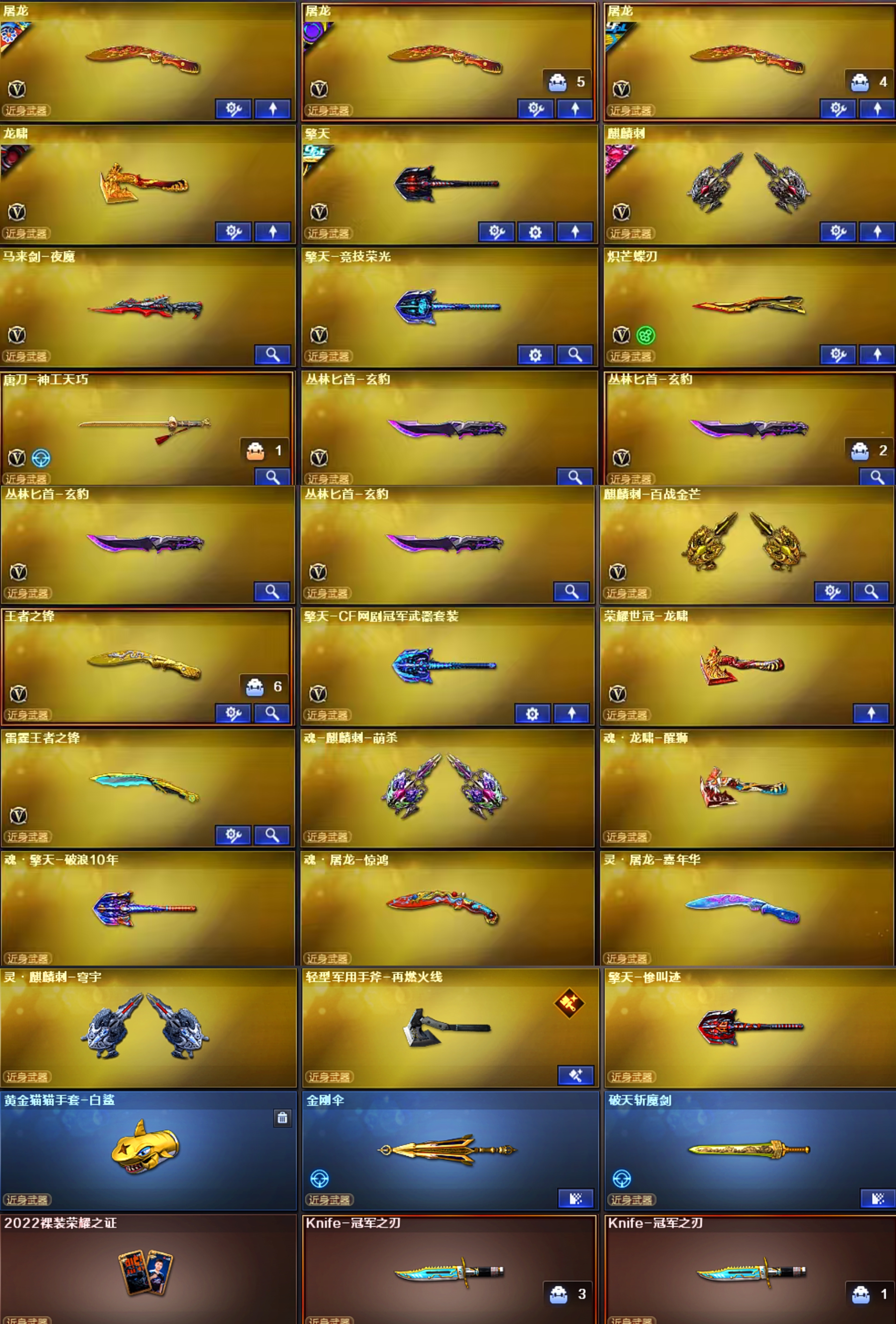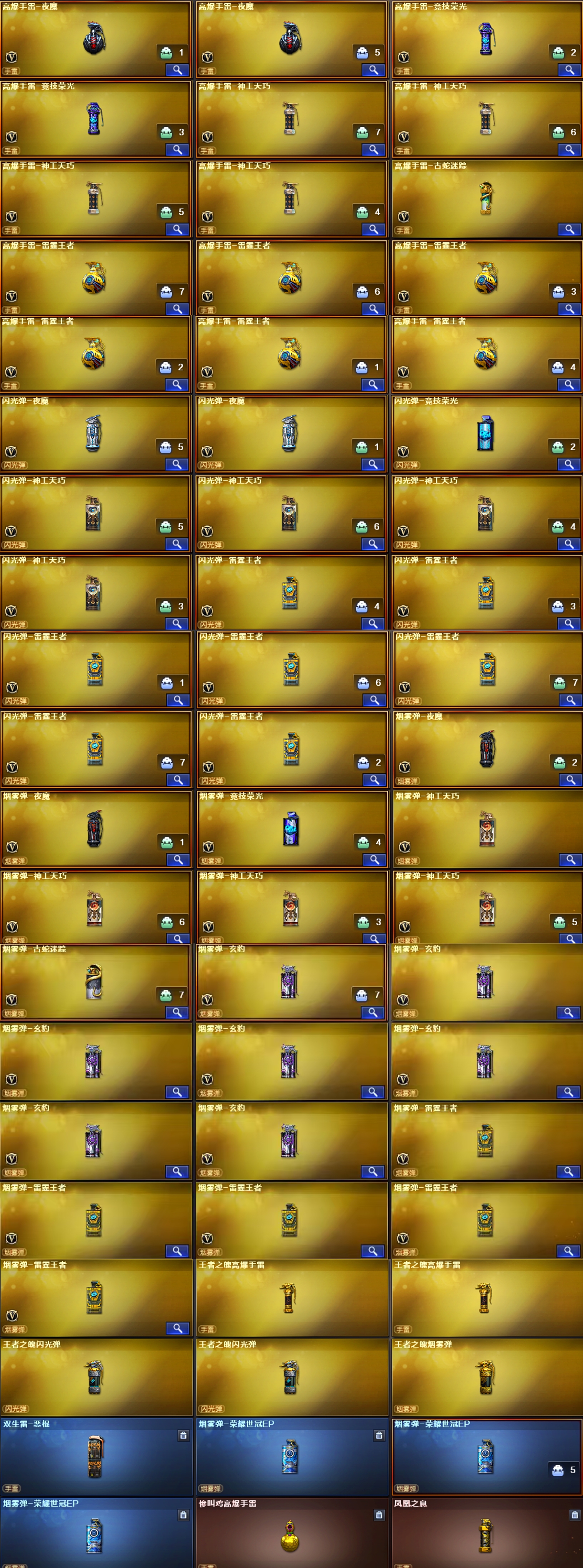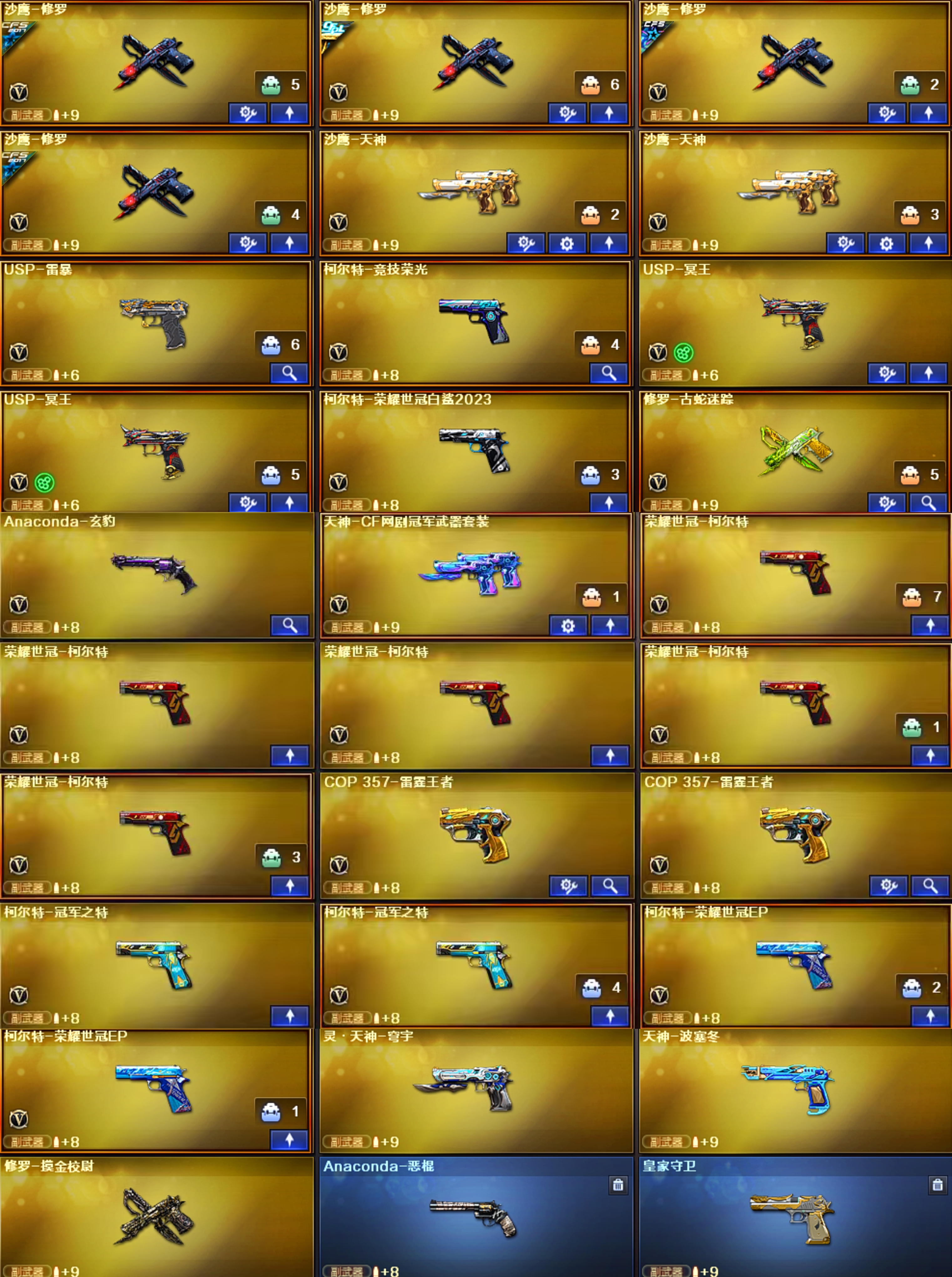 【王者武器】:【炫金无影-1,炫金雷神-1,王者之戮-1,炫金毁灭-1,王者之魄高爆手雷-2,高爆手雷-雷霆王者-6,王者之魄闪光弹-2,王者之魄烟雾弹-1,Barrett-雷霆王者-觉醒版-1,COP 357-雷霆王者-觉醒版-2,M4A1-雷霆王者-觉醒版-1,王者玄武-1,烈龙-悦心-觉醒版-1,烟雾弹-雷霆王者-觉醒版-5,王者之势-觉醒版-1,王者之幻-觉醒版-1,王者之锋-觉醒版-1,王者幻神-觉醒版-1,王者白虎-觉醒版-1,闪光弹-雷霆王者-觉醒版-7,雷霆王者之锋-觉醒版-1,炫金骑士-1】;USP-雷暴,荣耀世冠-柯尔特,柯尔特-荣耀世冠白鲨2023,柯尔特-冠军之特,炽芒蝶刃,Knife-冠军之刃,电竞教官-云悠悠,