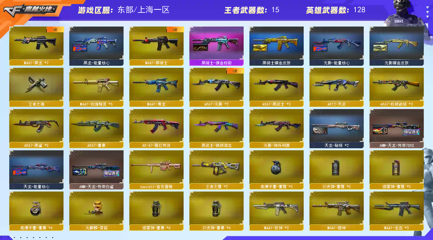 M200-幻神+电流骇客+巅峰荣耀】【QBZ03-金色蔷薇】【生化 2盘龙 6炼狱 6烈龙 蝴蝶 死亡之眼】【裁决】【毁灭+音效卡+魔灵】【极光】【雷暴套】【火麒麟+音效卡】【黑龙】【雷神+音效卡+雷神-荣耀之魄】【黑骑士】【王者之心 王者之影 王者之光】【无影 死神 黑武士 天启 机械迷城 黑鲨】【10手枪 修罗*7 天神*2 usp雷暴】【19近战 屠龙*5 龙啸 擎天*2 麒麟刺*6 斩神刀雷暴 王者之锋*3】【手雷 雷霆雷*5 雷暴雷*4 】【角色 关小雨 瞳 王者零;
