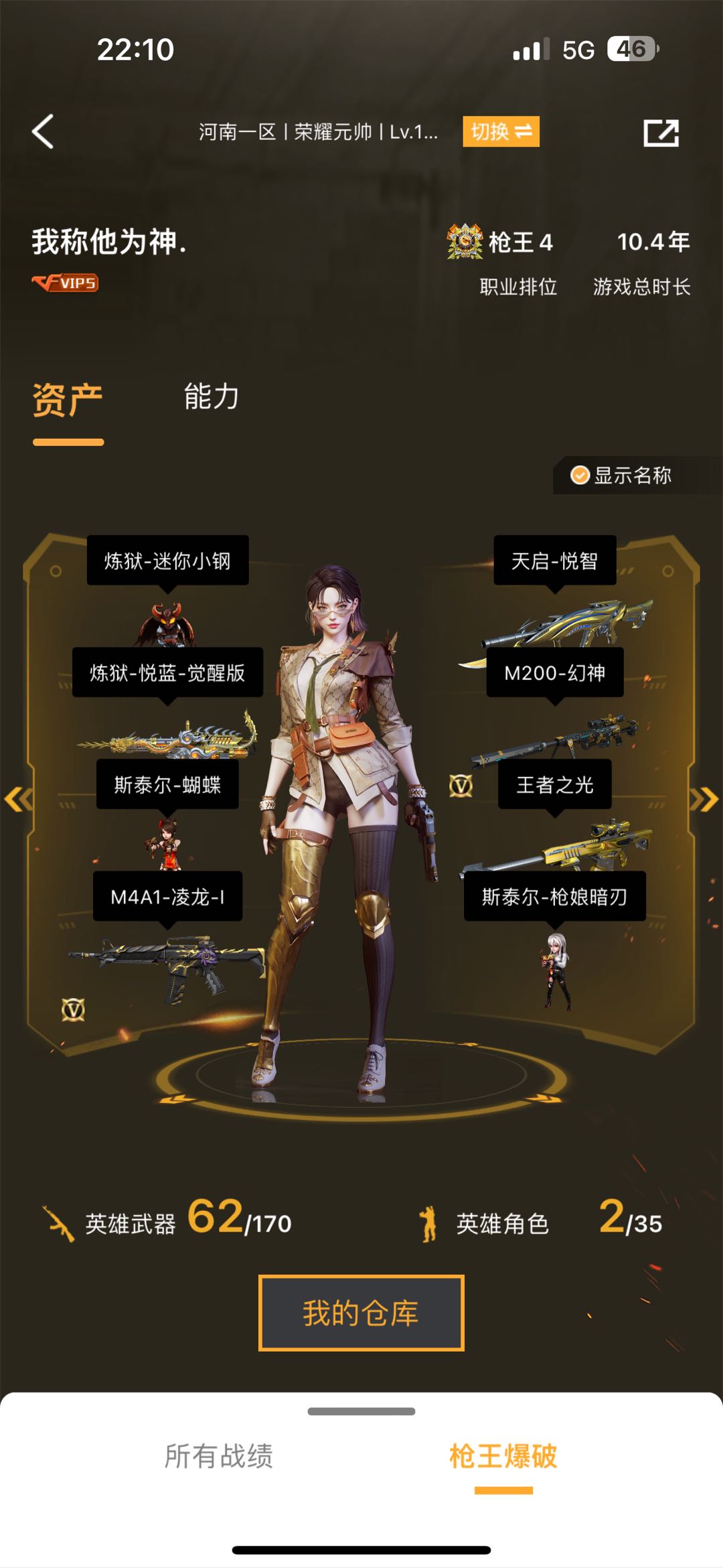 可排位 VIP4 61V 2王者 1炫金 毁灭耀金/雷神暗月/雷神脉冲核心/火麒麟心动糖果/修罗CFSTAR/传说艾莉莎 葵/M200-幻神/Barrett-毁灭/Barrett-极光(3)/barrett-金色蔷薇/M4A1-雷神/【重要角色】传说艾莉莎/葵/王者春/乔伊教练/铁骑荣耀/灵狐者-黄金海岸 【传说武器】 【英雄武器】M200-幻神/Barrett-毁灭/Barrett-极光(3)/barrett-金色蔷薇/M4A1-雷神/M4A1-死神/M4A1-黑骑士(3)/AK47-火麒麟/无影-;炽芒蝶刃,传说艾莉莎,RPK-盘龙,M200-幻神,