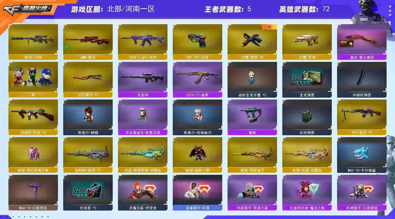 违规开挂导致封号100%起诉!!! 违规开挂导致封号100%起诉!!! 违规开挂导致封号100%起诉!!! 顶配生化:(双蝴蝶刀机动性拉满!) 最新奇幻宇宙泡泡象+生化副武器MAC鲨鱼+四防生化角色隼+斯太尔蝴蝶、掌上清道夫、枪娘暗刃+5盘6烈+炼狱惊涛骇浪+双面神+毒蜂+宙斯套+幻神+勇往直前不退包定期续费+弹匣齐全 提示: 此号充值超过2W;已在河南省周口市公安局进行虚拟财产备案,如遇封号,我们会锁定恶意租客注册手机号和登录游戏ip地址手机号码,提交给公安局进行立案,各位老板手下留情,绿色游戏请勿开鼠标宏和外挂谢谢;炽芒蝶刃,隼,RPK-盘龙,M200-幻神,