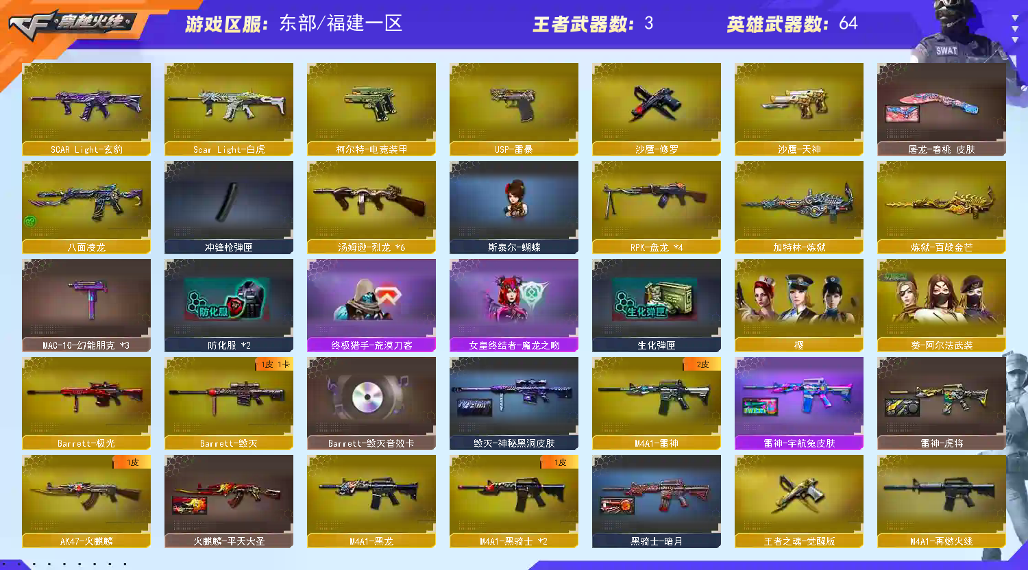 6烈蝴蝶4盘炼狱|绝迹语音包|AK雷暴M4A1夜魔|ScLi白虎|毁灭音效卡|生化爆破全装号 东部战区合区大区(安徽一区、福建一区、上海一区、上海二区、浙江一区、浙江二区、江苏一区、江苏二区、教育大区、移动专区)登录的时候选择福建一区。 【编 号】:FJ131 【角 色】:CFVIP4、大校等级、樱、灵狐者职业灵狐(捕食者之眼/生化觉醒/佣兵觉醒)、职业选手(绝迹语音包/捕食者之眼/佣兵觉醒/生化觉醒)、新娜塔莎、影舞者X、堕落天使、兰、深海之兰、夜玫瑰、威锋、烟雾保护头盔、闪光护目镜、双龙戒指 【主 武】:八面凌龙、AK47雷暴、白虎、M4A1夜魔、烈龙X6、斯太尔蝴蝶、玄豹、盘龙X4、加特林炼狱、王者之心、王者之武、炫金毁灭、火麒麟(平天大圣)、雷神(虎将)、黑骑士X2(暗月)、超新星、龙血、天龙X4、毁灭(音效卡)、极光、冰龙粉碎者、巨龙咆哮、神圣爆裂者 【副 武】:王者之魂(觉醒)、柯尔特电竞装甲、USP雷暴、天神、1911大黄蜂、COP小白龙、胜利之火、凤凰之火 【近 身】:斩神刀雷暴、擎天、龙啸、屠龙、无畏之矛、黄金充气大锤、金条、清刚、影之刃 【投 掷】:雷暴手雷套装X5、电竞装甲手雷套装X1、迷你生化手雷、深渊终结者手雷、凤凰之息、胜利之光、凤舞云烟 【道 具】:毁灭音效卡、深渊红龙玩偶、羊驼玩偶、黄金幸运猪猪玩偶、7个背包、AC(防弹头盔-防弹衣)、C4工具钳、手雷包、挑战弹夹、冲锋枪弹夹、机枪弹夹、手枪弹夹、步枪弹夹、狙击枪弹夹、散弹枪弹夹;USP-雷暴,RPK-盘龙,Scar Light-白虎,