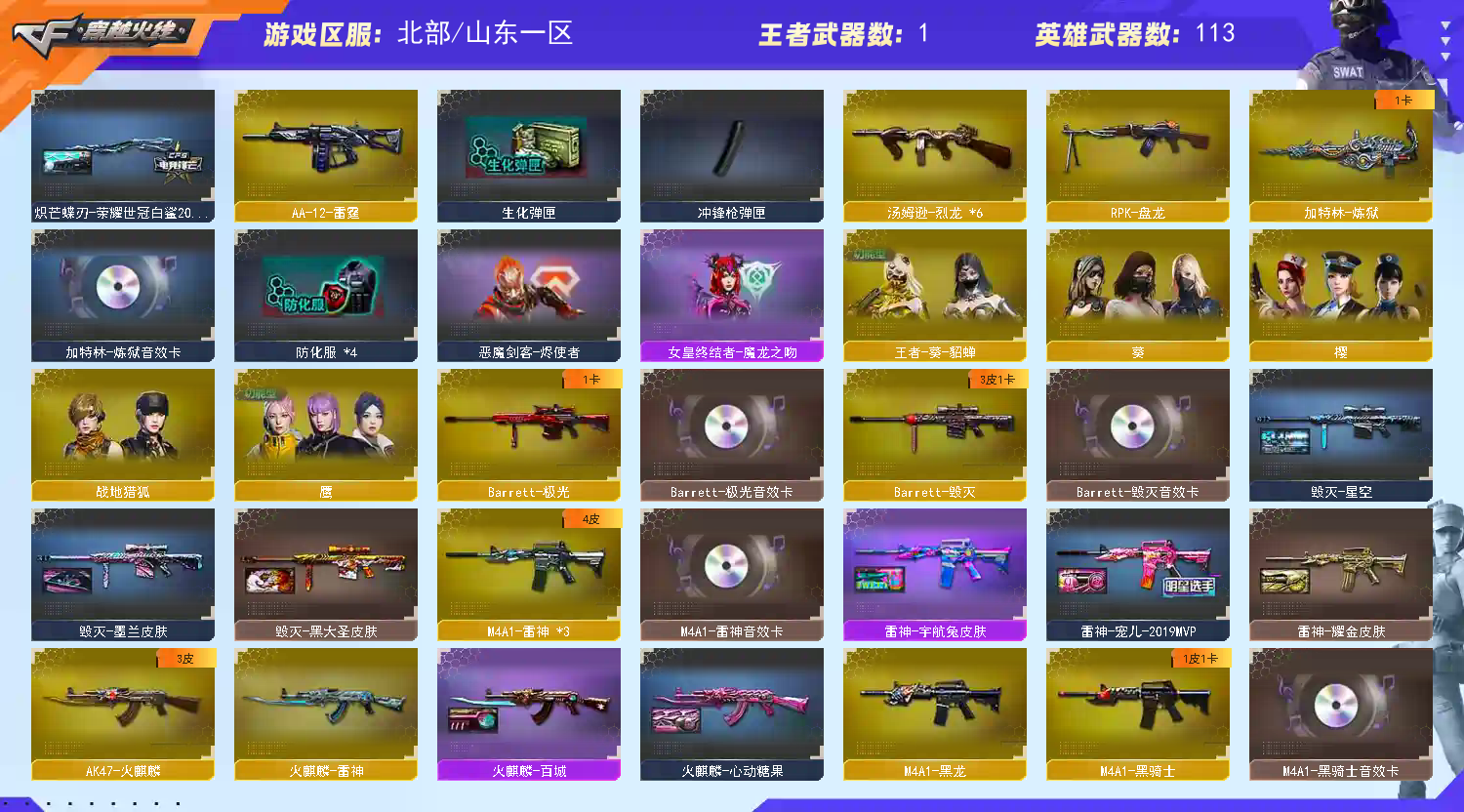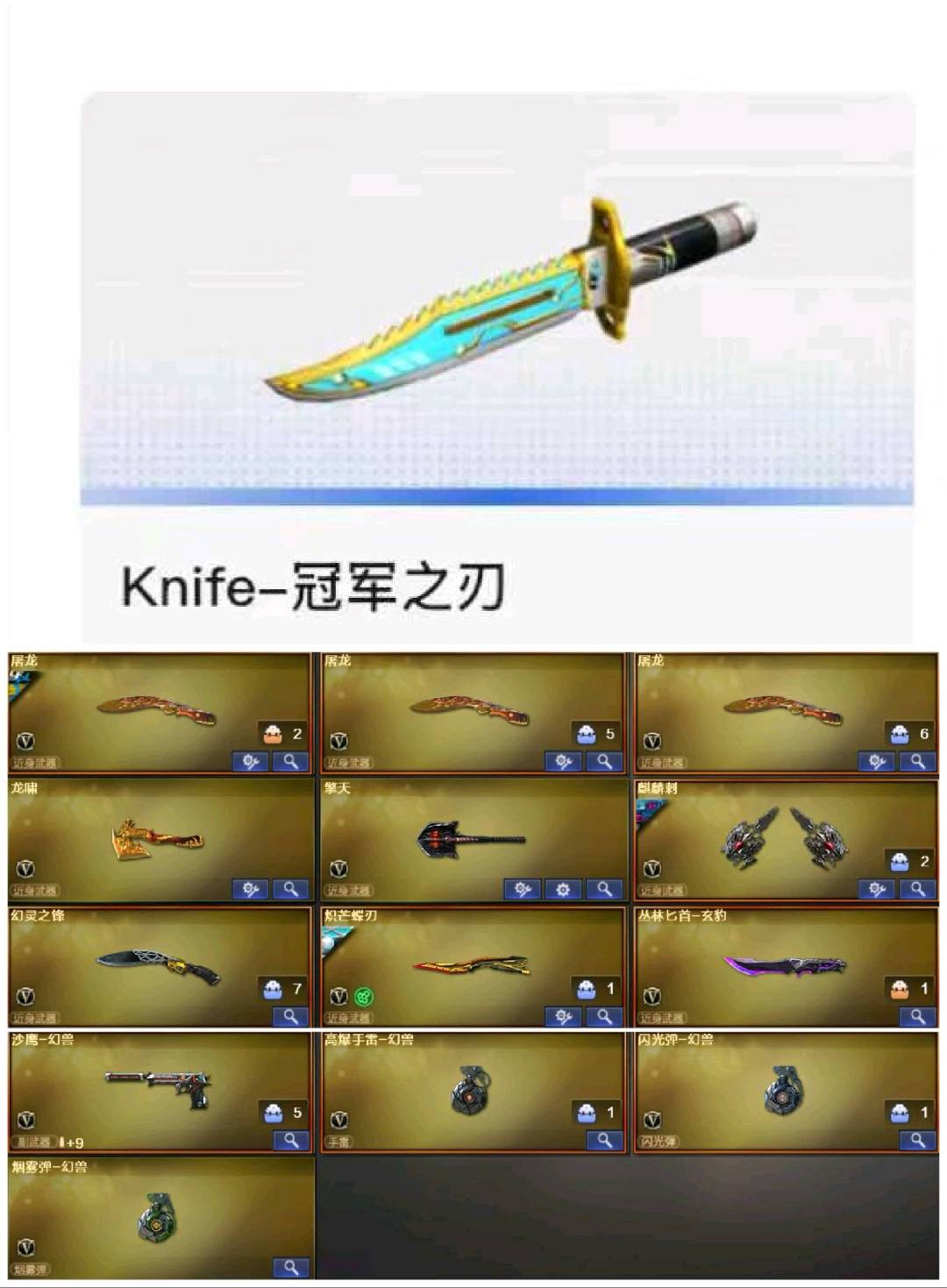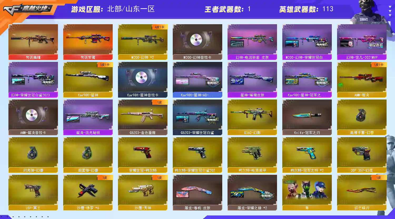 2传说,传说幽瞳+传说梦魇,角色4防鹰+4防隼,武器多多,音效卡多多,皮肤多多;荣耀世冠-柯尔特,柯尔特-荣耀世冠白鲨2023,柯尔特-冠军之特,炽芒蝶刃,Knife-冠军之刃,隼,RPK-盘龙,