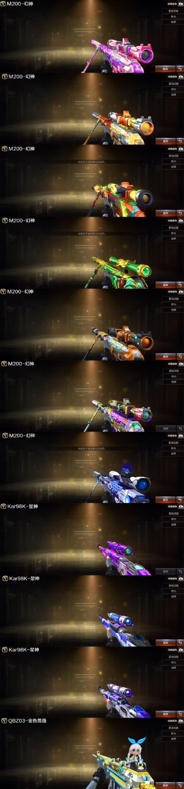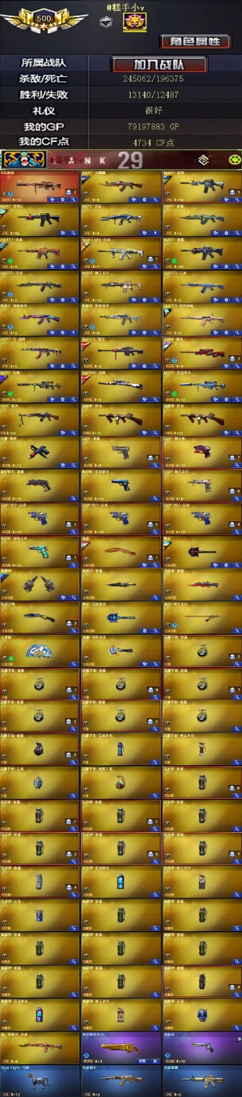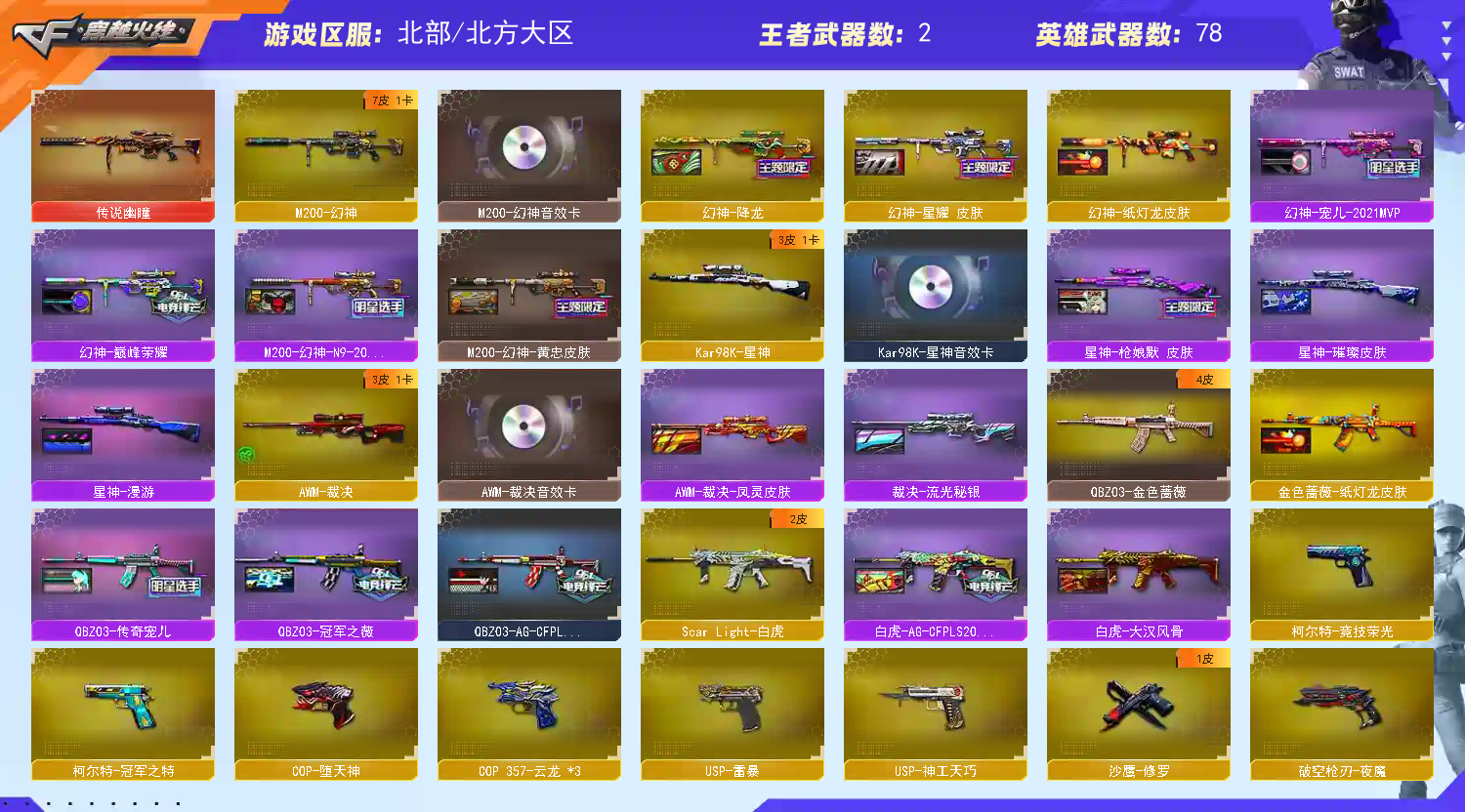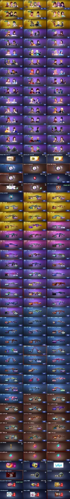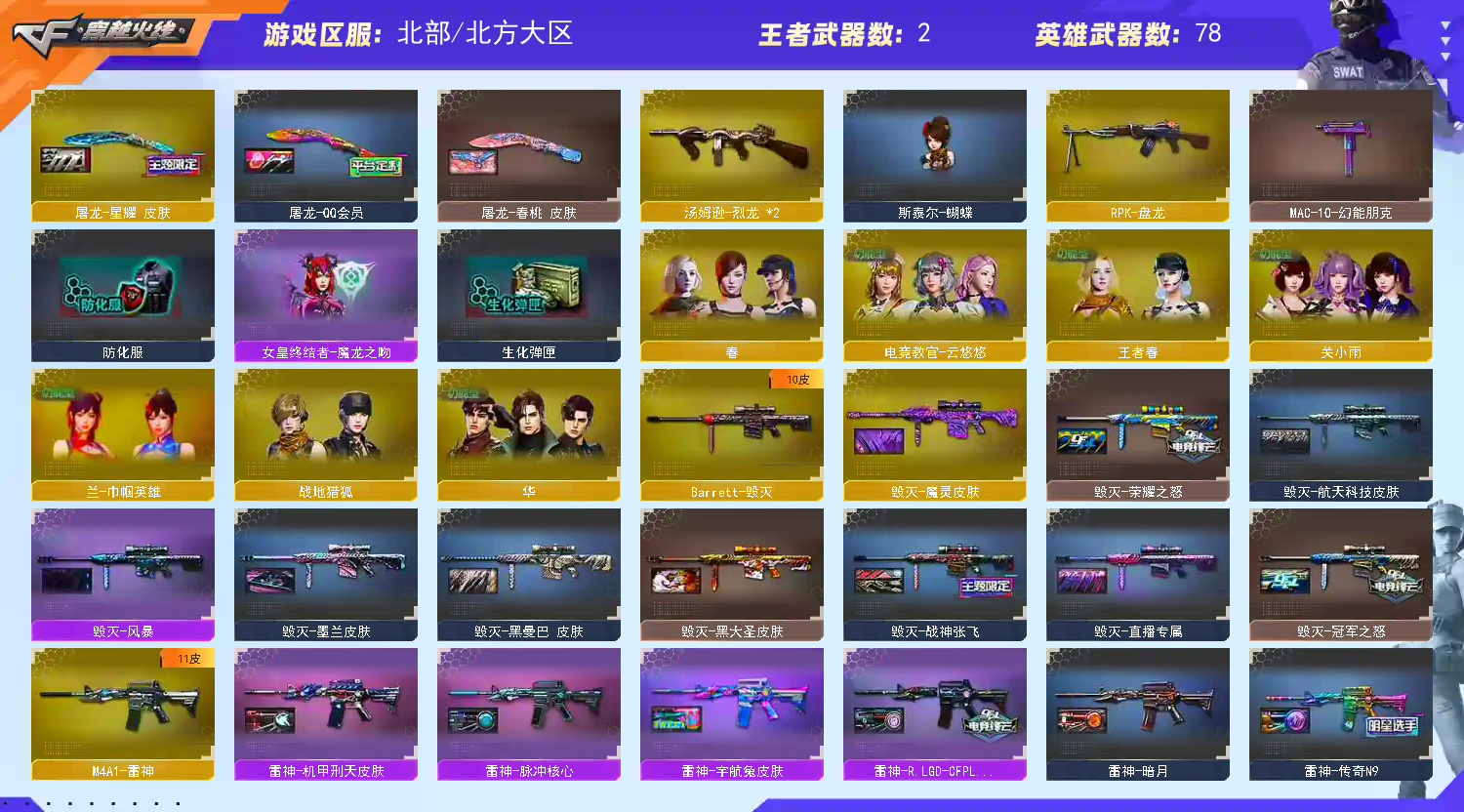 王者武器:高爆手雷-雷霆王者 英雄武器:传说幽瞳;AK12-天启;RPK-盘龙;汤姆逊-烈龙;超新星-热带奇洋;COP 357-云龙;闪光弹-云龙;云龙扇;QBZ03-云龙;烟雾弹-云龙;高爆手雷-云龙;Scar Light-白虎;龙啸-热带奇洋;高爆手雷-雷暴;烟雾弹-雷暴;闪光弹-雷暴;AK47-雷暴;USP-雷暴;斩神刀-雷暴;黑武士-锦绣游龙;屠龙;幻灵之锋;闪光弹-神工天巧;M4A1-神工天巧;唐刀-神工天巧;USP-神工天巧;烟雾弹-神工天巧;高爆手雷-神工天巧;沙鹰-修罗;麒麟刺;Kar98K-星神;QBZ03-天罚;AWM-裁决;HK417-朱雀;M4A1-黑骑士;擎天;M200-幻神;AK47-火麒麟;Barrett-毁灭;M4A1-雷神;柯尔特-冠军之特;AK47-B-战神;QBZ03-金色蔷薇;M200-竞技荣光;高爆手雷-竞技荣光;闪光弹-竞技荣光;烟雾弹-竞技荣光;擎天-竞技荣光;柯尔特-竞技荣光;M4A1-夜魔;COP-堕天神;烟雾弹-夜魔;高爆手雷-夜魔;闪光弹-夜魔;破空枪刃-夜魔;马来剑-夜魔 角色:春;电竞教官-云悠悠;关小雨;兰-巾帼英雄;华;活力;USP-雷暴,柯尔特-冠军之特,Knife-冠军之刃,电竞教官-云悠悠,RPK-盘龙,QBZ03-金色蔷薇,传说幽瞳,