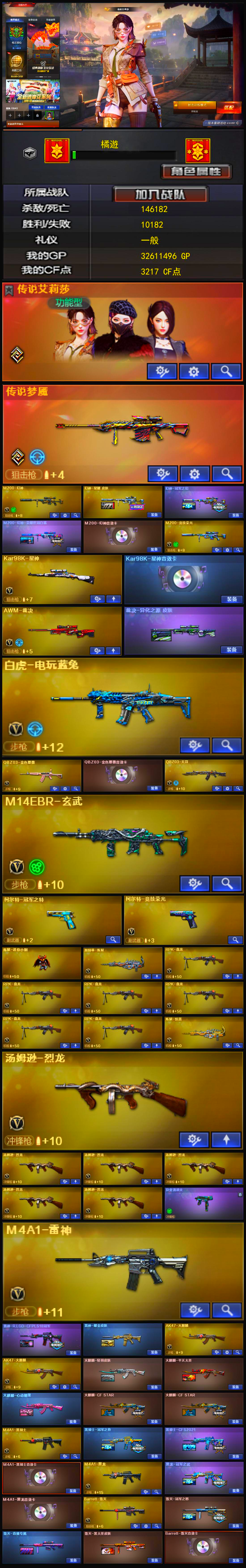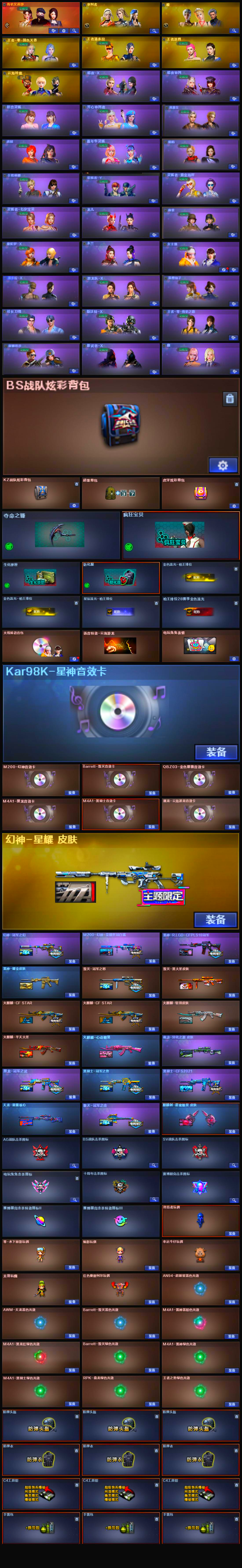【亮点解析 传说角色 幻神三件套 星神三件套 幻神热门皮肤 生化六盘六烈 爆破生化都能玩】 【传说艾莉沙】 【m200幻神+音效卡+幻神-冠军之幻+幻神-星耀+荣耀世冠白鲨】 【竞技荣光套】 【98k星神+音效卡】 【传说梦魇】 【qbz金色蔷薇+音效卡】 【火麒麟】 【黑龙+音效卡+黑龙-冠军之武】 【雷神+雷神-lgd18冠军】 【黑骑士+音效卡+黑骑士-冠军之势】 【毁灭+音效卡+毁灭-冠军之怒】 【极光】 【裁决】 【王者之势】 【超新星 龙血 玄武 天罚 玫瑰精灵 烈火 海王】 【生化 6盘龙 2炼狱 6烈龙 异变清道夫】 【手呛*4 修罗*2 冠军之特】 【近战*9 屠龙*2 龙啸 擎天 麒麟刺 幻灵之锋】 【手雷*3 幻灵雷 神工天巧雷 竞技荣光雷】 【小人呛 雷神刀锋 迷你小钢】 【动物呛 cat】 【四防角色 王者零国色天香 王者潘多拉 王者涂鸦 女主播】 【角色 审判者 瞳 云海玲珑】 【幻神音效卡 星神音效卡 黑龙音效卡 金色蔷薇音效卡 毁灭音效卡 黑骑士音效卡】 【云海游龙炫彩背包 kz炫彩背包 bs炫彩背包 虎牙炫彩背包】;柯尔特-冠军之特,传说艾莉莎,RPK-盘龙,QBZ03-金色蔷薇,M200-幻神,Kar98K-星神,