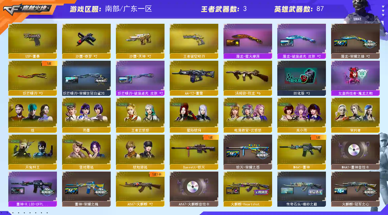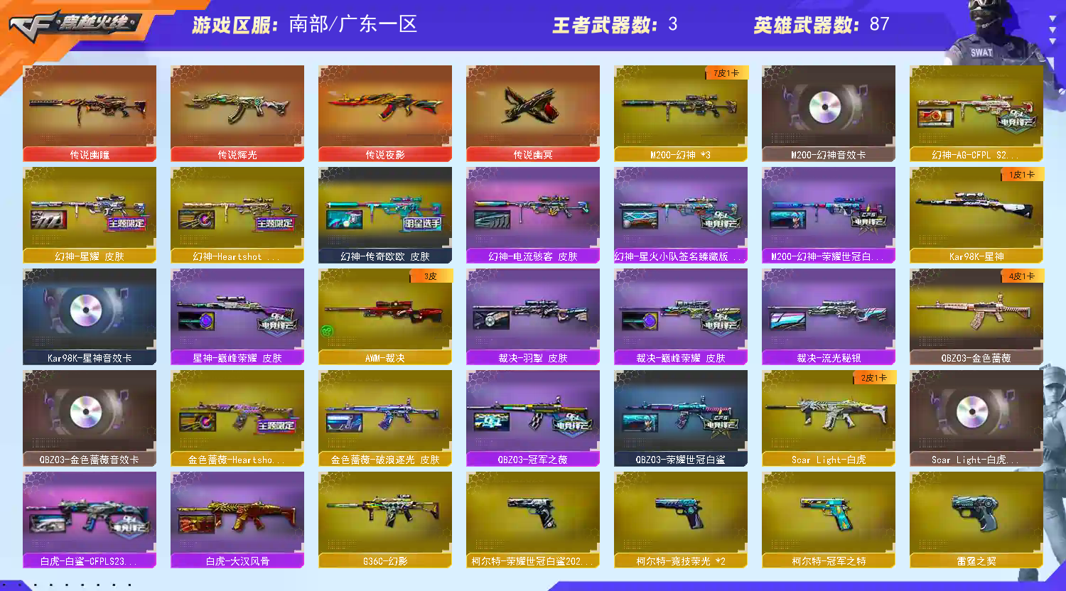 【南部】100v传说幽瞳4传说❤幻神新AGs24+欧欧7皮三件套❤星神三件套❤G36c幻影❤三把蝴蝶;USP-雷暴,柯尔特-荣耀世冠白鲨2023,传说幽冥,柯尔特-冠军之特,炽芒蝶刃,电竞教官-云悠悠,QBZ03-金色蔷薇,