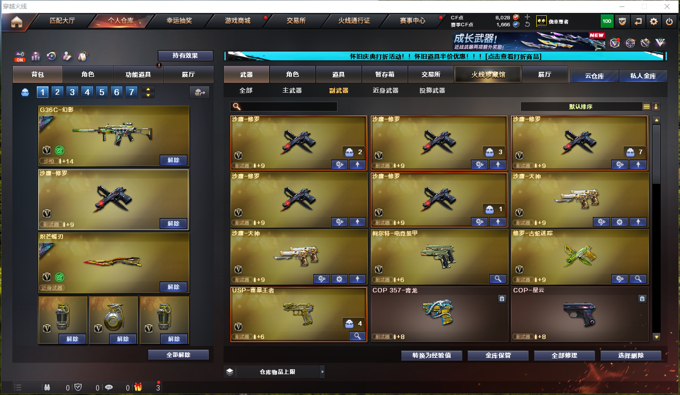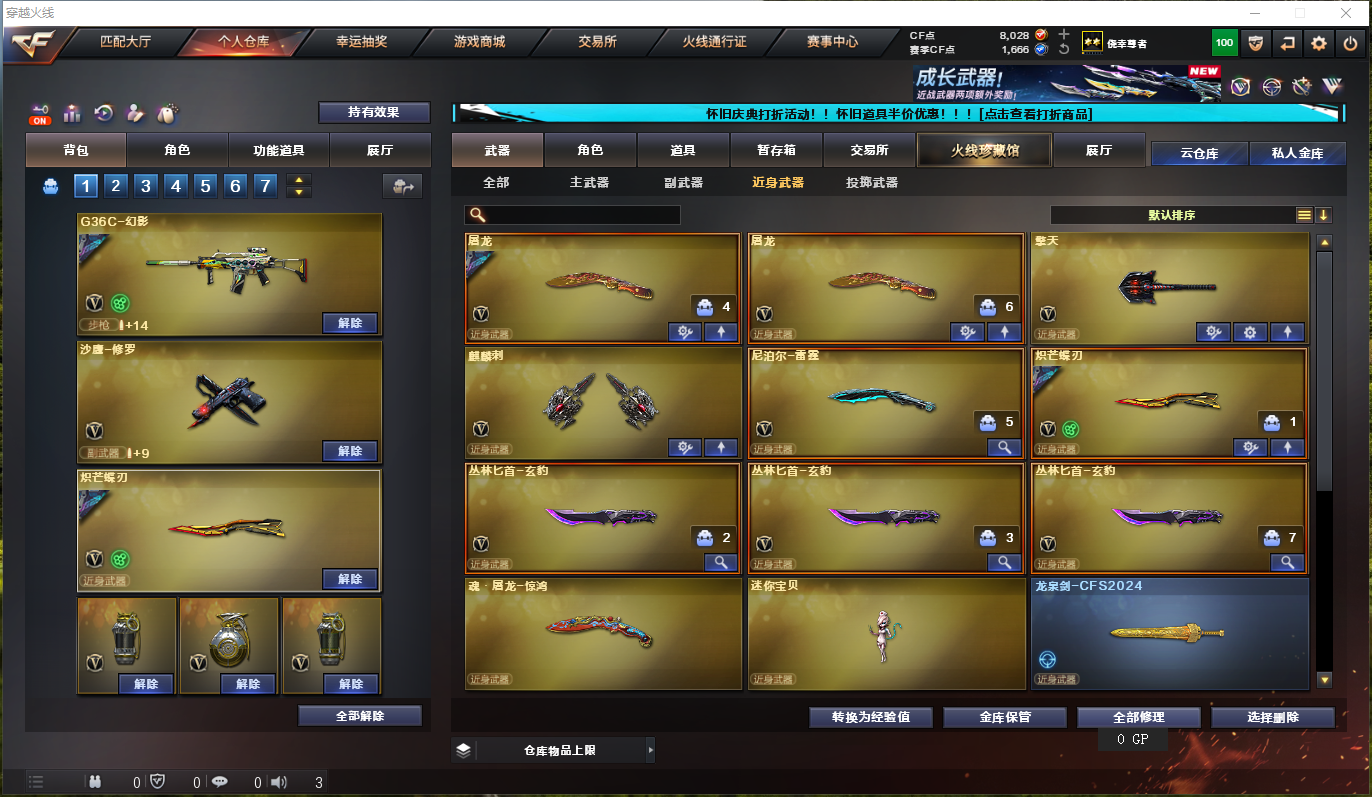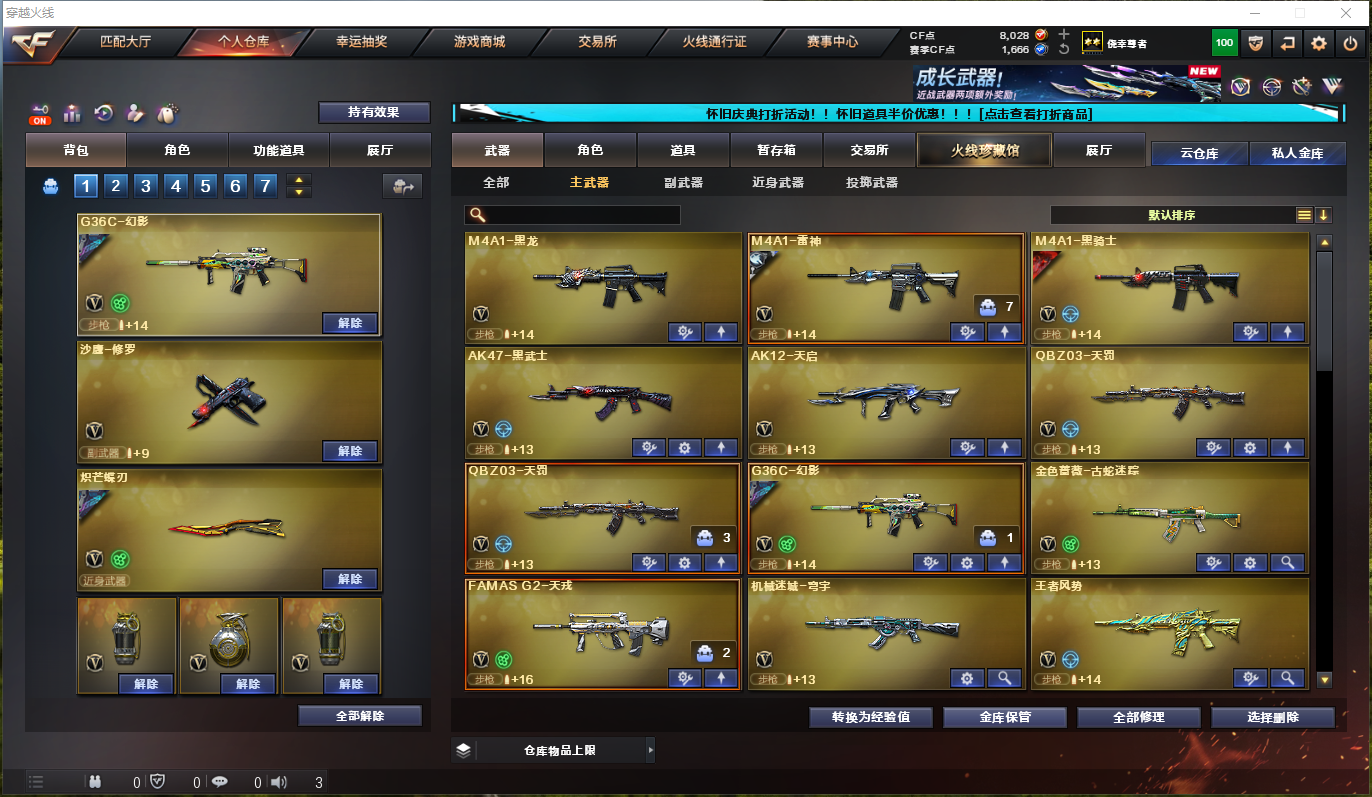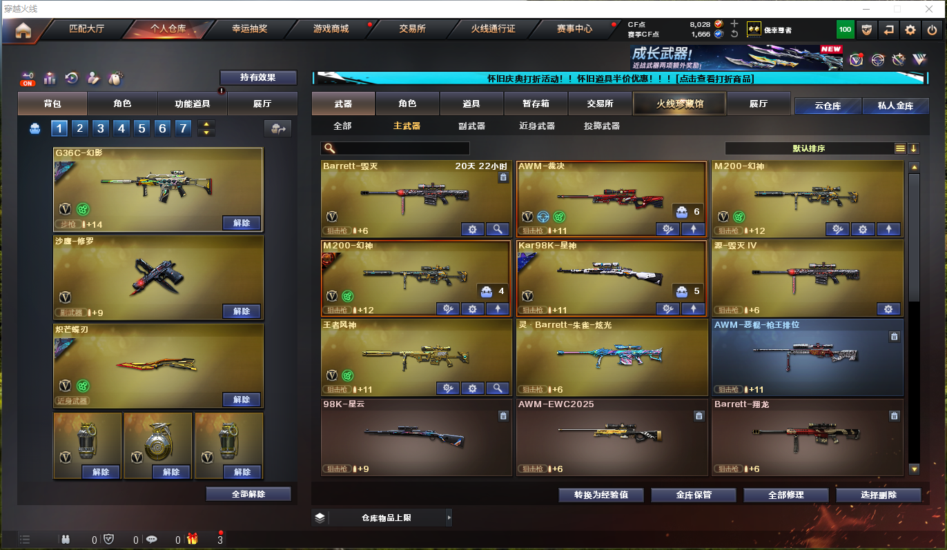 【m200-幻神×2带幻神-丹凤皮肤带音效卡】【98k星神带星神-璀璨皮肤带音效卡】【裁决带音效卡】【g36c-幻影】【炽芒蝶刃】【四防星际战将】【四防王者-魅影】【四防暗夜审判】狙击呛:【m200-幻神×2】【98k星神】【裁决】【王者风神】步呛:【g36c-幻影】【黑龙】【雷神】【黑骑士】【黑武士】【ak12-天启】【qbz03-天罚×2】【金色蔷薇-古蛇迷踪】【famas g2-天戎】【机械迷城-穹宇】【王者风势--王者雷影】【m4a1-苍鸣雷神】手呛:【柯尔特-电竞装甲 修罗-古蛇迷踪 usp-雷霆王者】刀具:【 炽芒蝶刃 屠龙×2 擎天 麒麟刺 尼泊尔-雷霆 丛林匕首-玄豹×3】手雷:【雷霆高爆手雷 雷暴高爆手雷 电竞装甲恶棍 竞技荣光高爆手雷套×2 古蛇迷踪高爆手雷套 玄豹高爆手雷 雷暴王者高爆手雷】音效卡:【幻神音效卡 星神音效卡 qbz03-天罚音效卡×2 裁决音效卡 黑骑士音效卡】角色:【四防星际战将】【四防王者-魅影】【四防暗夜审判】【玄豹 乔伊教练 蛇隐宗 雪域霜狐】皮肤:【幻神-丹凤】【幻影-破浪逐光】【雷神-机甲刑天】【星神-璀璨】【屠龙-破浪逐光】【炽芒蝶刃-破浪逐光】【scar白虎-暗星】;USP-雷暴王者,炽芒蝶刃,G36C-幻影,M200-幻神,Kar98K-星神,