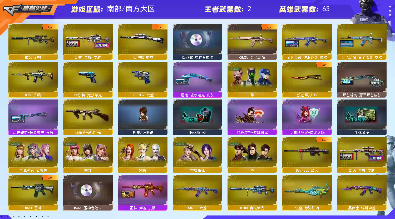 首页 > 租号大厅 > 穿越火线 > 电信区/南方大区 > 编号105/星神音效卡幻神皮肤g36c幻影4防隼4防云悠悠晴雅6烈龙蝴蝶2蝴蝶刀带皮竞技荣光全套
