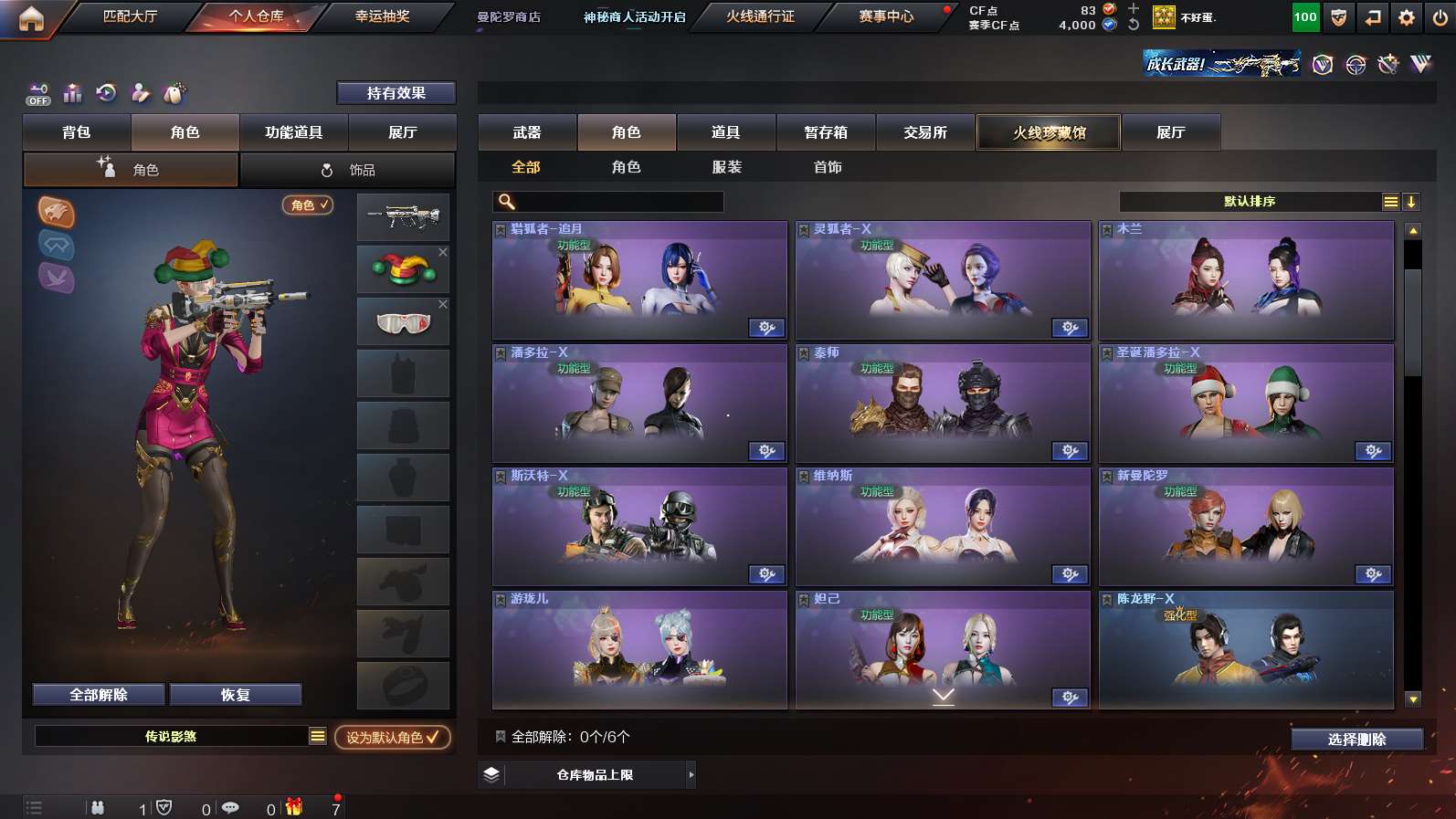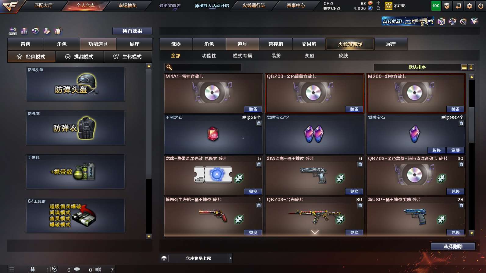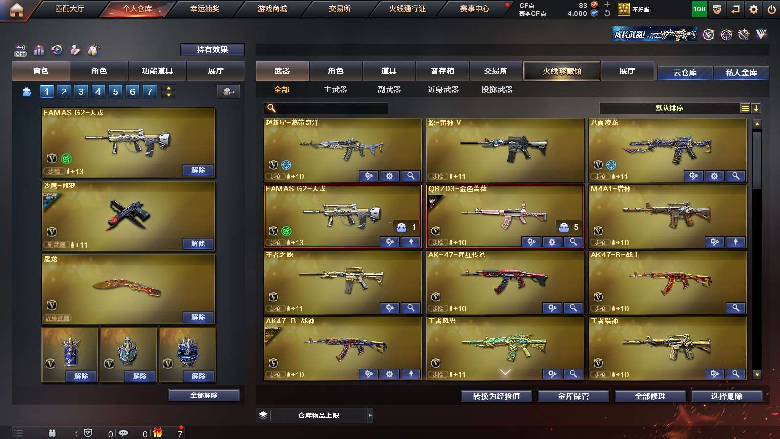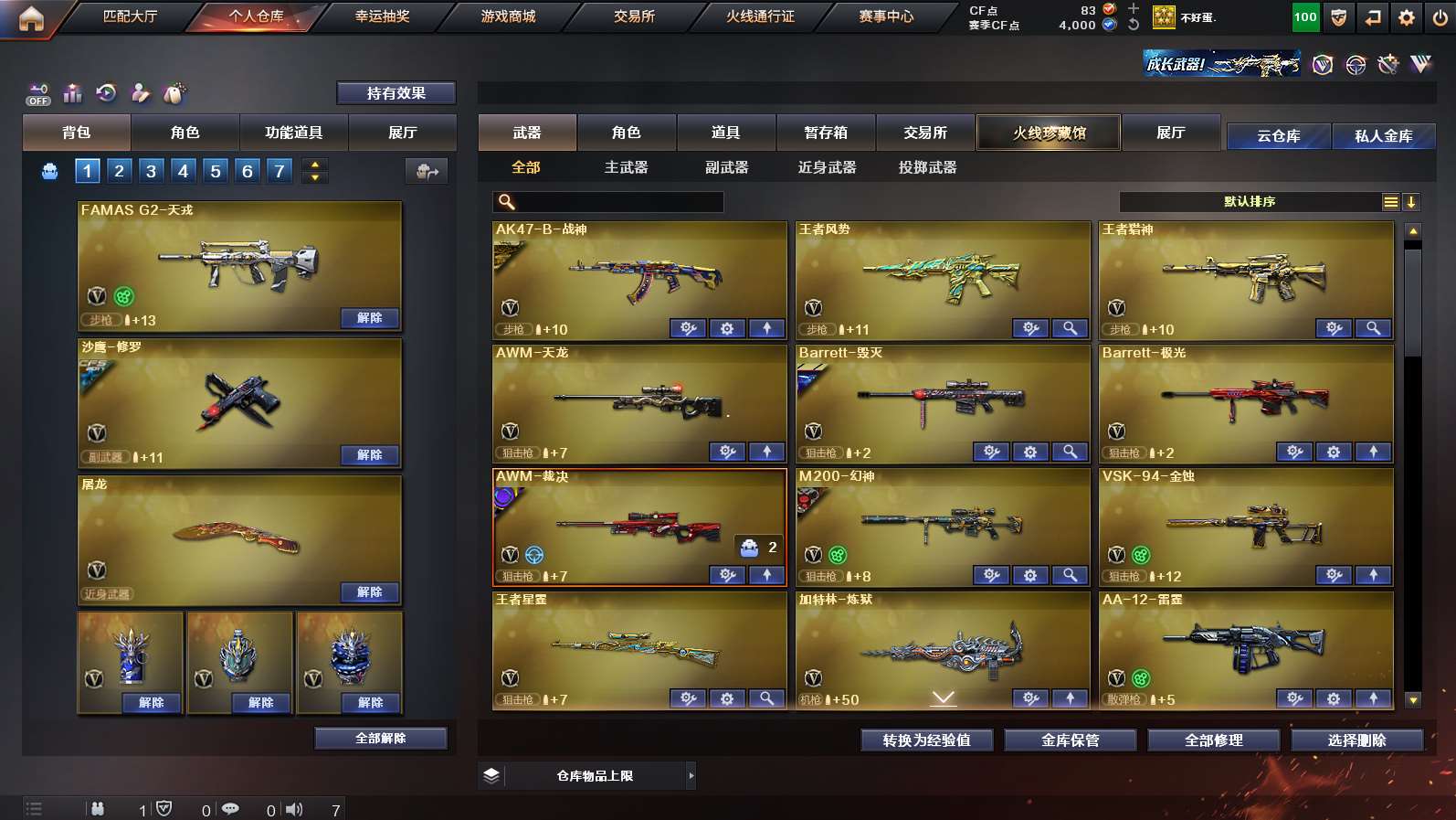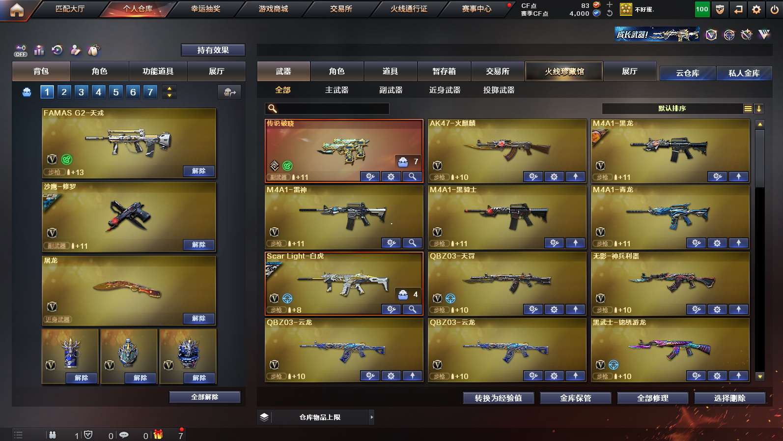 传说影煞》《传说破晓》《m200幻神➕幻神n9➕幻神agcfpls24冠军皮肤➕幻神音效卡》《裁决➕裁决异化之源➕裁决巅峰荣耀➕裁决音效卡》《王者星霆》《星神长生圣莲》《cop云龙 1911大黄蜂》《炽芒蝶刃》《王者猎神 王者风势》《云龙套》《八面凌龙》《白虎》《famas天戎》《qbz金色蔷薇》《青龙》《qbz天罚》《毁灭》《火麒麟》《雷神》《黑骑士》《炼狱》《机械姬 雨墨 奇洋探员》《超级背包》《天罚音效卡 雷神音效卡 qbz金色蔷薇音效卡 》《雷神女团皮 白虎白鲨cfpls23皮肤 雷神lgdcfpls18冠军 白虎霓虹机甲 qbzagcfpls19冠军 毁灭秦师 毁灭agcfpls15冠军 》;炽芒蝶刃,传说影煞,QBZ03-金色蔷薇,M200-幻神,Scar Light-白虎,