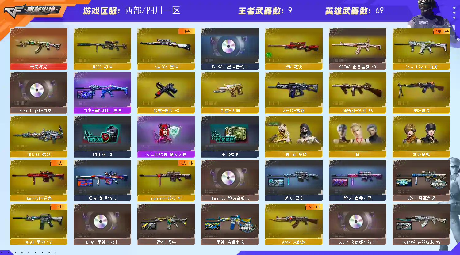 《传说辉光》《m200幻神》《98k星神+星神音效卡》《裁决》《王者星神》《1911大黄蜂》《炽芒碟刃》《白虎》《朱雀》《qbz天罚》《王者冰魄》《qbz金色蔷薇》《烈火》《毁灭》《火麒麟》《雷神》《黑骑士》《6烈》《牛牛ak》《雷神精英刀锋 火麒麟绝迹 金色蔷薇空》《乔伊教练 4防王者葵貂蝉 超能女侍觉 女主播》《黑骑士音效卡 火麒麟音效卡 白虎音效卡 毁灭音效卡 雷神音效卡》《白虎霓虹机甲 毁灭cfs2018 火麒麟cfs2018 毁灭冠军之怒 火麒麟ag战队皮 雷神荣耀之魄》a背包套装扩展券《永久ac 永久工具钳 永久手雷包》;炽芒蝶刃,RPK-盘龙,QBZ03-金色蔷薇,M200-幻神,Scar Light-白虎,Kar98K-星神,