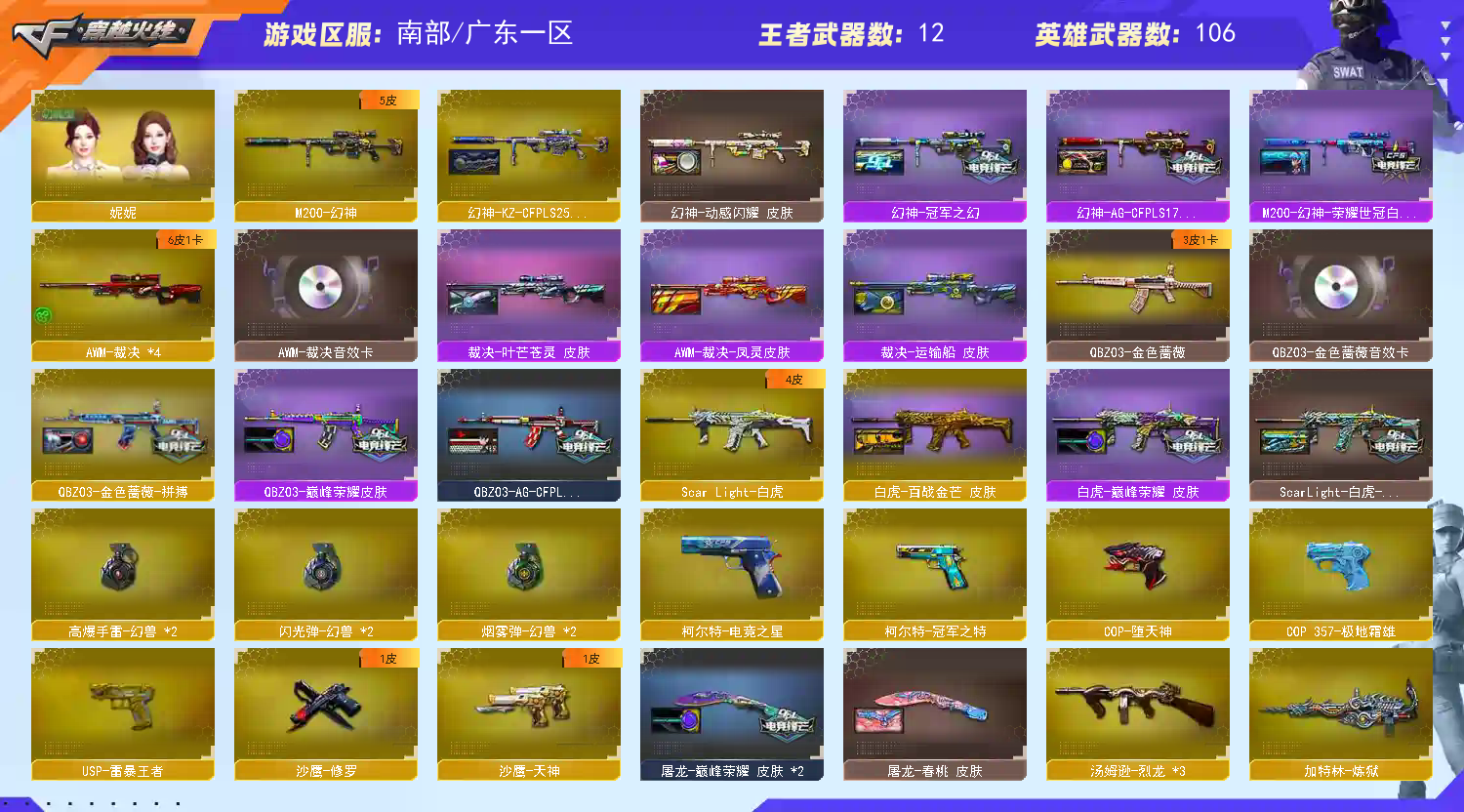别开挂,监控可以看到yy号和频道,平台也有实名信息,开挂直接曝光并法院起诉。请挂哥绕道谢谢;USP-雷暴王者,柯尔特-冠军之特,妮妮,QBZ03-金色蔷薇,M200-幻神,Scar Light-白虎,