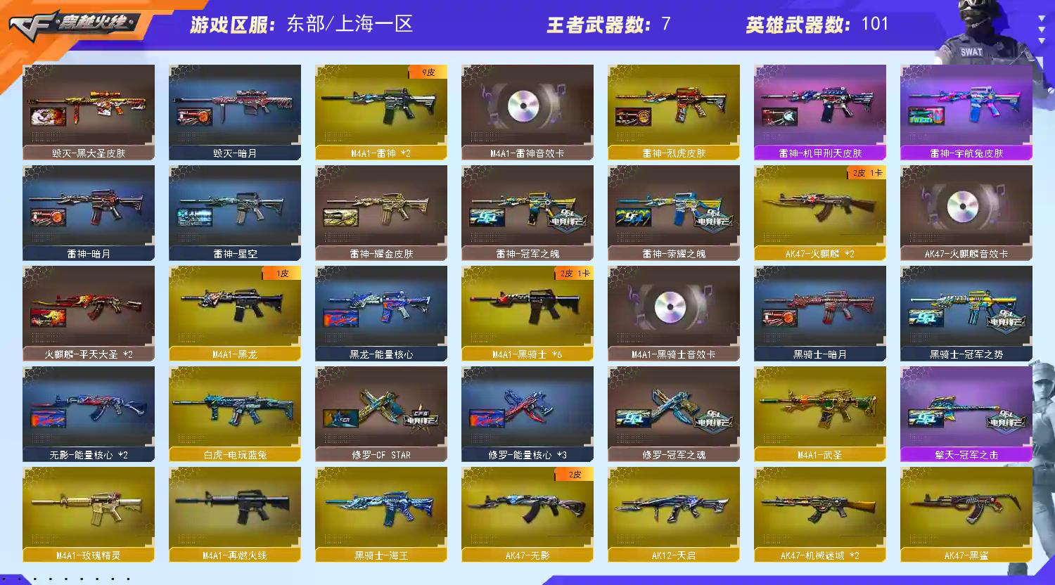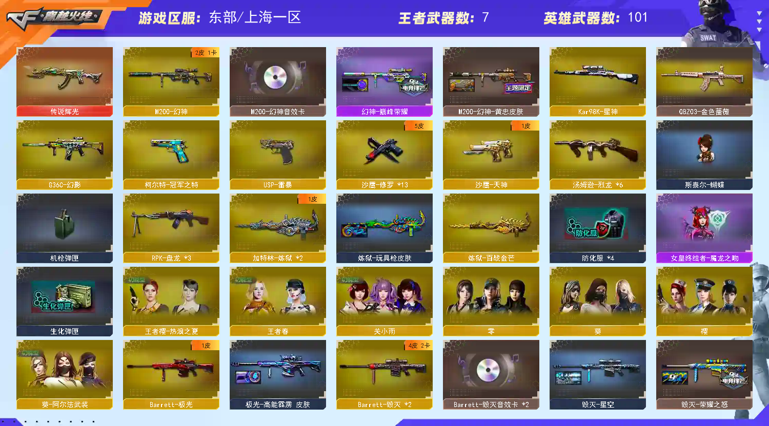 东部战区:福建、安徽、上海、浙江、江苏、教育大区及移动专区的游戏账号。 编号E212号|133V|上海一区|昵称:阿俊:1992(VIP6) 本号装备更新于:2025年2月4日 【皮肤】:幻神-巅峰荣耀、雷神-宇航兔皮肤、M200-幻神黄忠皮肤(首发)、M4A1-千变-孔明皮肤、雷神-冠军之魄、擎天-冠军之击、荣耀之怒、雷神-荣耀之魄、雷神耀金(超稀有)、冠军之魂x2、毁灭星空、雷神-星空、天龙秘银(皮肤)、火麒麟-CFSTARx2、天龙-CFSTAR、黑龙-能量核心、无影-能量核心x2、修罗-能量核心、天神-暗月、黑骑士-暗月、毁灭-暗月、黑龙-暗月、毁灭-黑大圣皮肤、火麒麟-平天大圣x2、雷神-烈虎皮肤、 【角色】:葵、樱、零、关小雨、飞虎队-X、潘多拉-甜心教官、龙儿-小淘气、猎狐者-Y、代号:翼、麻雀、剑齿虎-X、樱-战斗天使、铁扇公主、五号兵器、王者春、刀锋-X、艾比、陈龙野-Z、灵狐者-七夕宝贝、奇洋探员、波特博士、王者春、五号兵器、游珑儿、樱-战斗天使、剑齿虎-X、猎狐者-追月、嘉年华灵狐、超能特工、铁骑荣耀、兔囡囡、潘多拉-锋芒精英、深海之兰-X、猎狐者-追月、电竞少女、沃特X、曼陀罗-礼服、狐妖儿、救世主-X、王者樱-热浪之夏、G.E.M.邓紫棋、堕天使、雷霆-β、蜀雪、救世主-X、潜龙队-X、潘多拉、芳心审判者、初恋灵狐、深海之兰、复仇者、夜玫瑰、威锋、灵狐者、零-水下丽影、影武者-X、国境防卫者、龙儿、潘多拉-X、猎狐者、猎狐者-X、灵狐者、斯沃特精英、雷豹、金戈、猎狐者-X、新奥摩、猎狐者、铁骑、新赛斯、奥摩、赛斯、斯沃特、 【王者】:王者之心-觉醒版、王者云击x2、王者之势、王者之影、炫金雷神x2、迷你深渊冰龙(迷你近身)x2、斯泰尔蝴蝶(生化迷你)、夺魂x2、 【主武】:G36C-幻影、传说辉光、Kar98K-星神(首发)、征服者-寒冰之狱 [Lv Max]、征服者-超越1x6、烈龙x6、盘龙x3、加特林炼狱x3、死亡之眼、M200-幻神、QBZ03-金色蔷薇、毁灭x2、天龙、极光、Barrett-暗月传说x4、barrett-金色蔷薇、雷神x2、黑龙、火麒麟x2、黑骑士x6、无影、玫瑰精灵、黑鲨、天启、机械迷城x2、M4A1-武圣、超新星、AK47-B-战神x2、猩红传说x2、魂·火麒麟-百城x2、黑骑士-海王、御·雷神-小白龙x2、机甲撕裂者III、KAC-圣炎切割者III、魂·雷神-宇航兔兔、源·毁灭x3、源·天龙、源·天启、源·雷神x3、源·火麒麟x3、火麒麟-暗月x2、源·青龙、源-黑龙x3、金牛座x3、处女座、白羊座x2、神罚x3、9A91-赤血龙魂、EVO III-赤血龙魂、激光毁灭者IIIx2、神圣爆裂者-末日III、M4A1-十二生肖·龙-雷神x2、M4A1-英雄-能量核心、神圣爆裂者IIIx3、M4A1-战龙、98K-黑金、98K-火山、98K-冰雪霸主x2、破天狂龙、黄金M249、黄金乌兹双枪、黄金MP5-A、黄金9A91、黄金AK-47、黄金KACx3、斯太尔-封神、御·炼狱-女娲、御·雷神-烈虎、 【副武】:Colt1911-宇航兔兔、修罗x12、沙鹰-天神、USP-雷暴、Glock18-武圣、COP-小白龙x5、新USP-战龙、阐释者x3、MAC-10-涂鸦、G36C-宇航兔兔x2、源·天神x2、COP-绚樱、迷你手枪x3、COP-二次元、Colt 1911-大黄蜂、M66-翔龙、 【近身】:无影-神兵利器、擎天-竞技荣光(最近年套)、金刚伞(全新)x2、水晶宝珠、屠龙x5、猫猫手套、擎天x2、龙啸x2、麒麟刺、斩神刀-雷暴、无畏之矛、轻型军用手斧-镜x2、唐刀-盛世太平、青花扇、丛林匕首-黑虎x2、军用手斧-战龙、黄金生化钩x2、轻型军用手斧-CFS、太极扇、金砖、手斧-n1ce冯永强、干将莫邪、玫瑰手斧、黄金炒锅x3、双龙、金箍棒、暗金鹰爪、断离x2、破天斩魔剑、鹰爪-枪王排位x2、纯金军用铁锹、寒冰之锤、扳手、黄金充气大锤、 【投掷】:烟雾弹-雷暴x4、闪光弹-雷暴x4、高爆手雷-雷暴x3、迷你生化手雷x2、高爆手雷-雷蛇x3、高爆手雷-SS、生化手雷、凤凰之息x2、闪光弹-京剧蓝、闪光弹-CFS2017纪念版、烟雾弹-CFS2017纪念版x3、闪光弹-网把、闪光弹-枪娘、闪光弹-宇航兔兔x2、玫瑰手雷x2、 【光效】:王者之幻金色光效、炼狱-悦蓝金色光效、屠龙蓝色光效x3、龙啸蓝色光效、擎天蓝色光效、汤姆逊-烈龙蓝色光效x2、王者之幻金色光效、王者之影金色光效、修罗蓝色光效x4、炼狱蓝色光效x2、毁灭蓝色光效x2、天龙蓝色光效、火麒麟蓝色光效、麒麟刺蓝色光效、 【玩偶】:关羽玩偶、战舰玩偶、电磁巨兽玩偶、王者刀锋玩偶、魅影玩偶、葵玩偶x2、幸运牛仔玩偶、牛魔王玩偶-无情烈焰x2、 【道具】:M200-幻神音效卡、黑骑士音效卡、超级对讲机(加10%子弹)、超级背包、生化弹匣、炫彩背包、夺命之镰、防化服x2、迷雾幽灵x2、灵魂忍者(矮子)x2、变异宝贝、疯狂宝贝x3、妖姬x2、BS战队炫彩背包、步枪弹匣(194天20小时)、冲锋枪弹匣(44天17小时)、7个背包;USP-雷暴,柯尔特-冠军之特,RPK-盘龙,QBZ03-金色蔷薇,G36C-幻影,M200-幻神,Kar98K-星神,