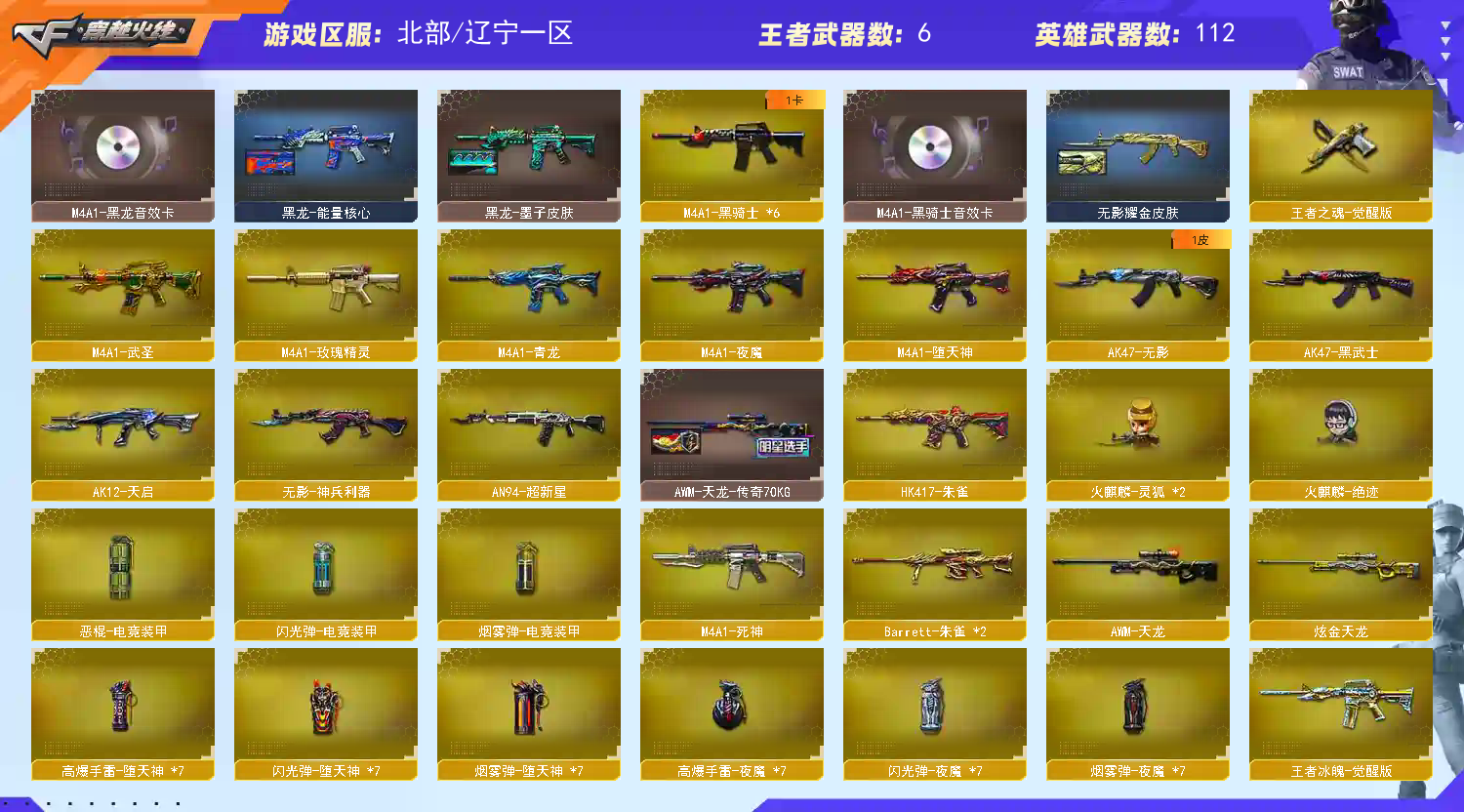 M200幻神|98K星神|6烈龙死亡之眼|Sar白虎|117V5盘炼狱|朱雀|雷神音效卡|生化爆破全装号 117把英雄武器/5把王者武器/3把炫金武器/堕天神套装/夜魔套装 北部战区合区大区(河北一区、辽宁一区、辽宁二区、辽宁三区、山东一区、山东二区、河南一区、河南二区、北京一区、北京二区、黑龙江一区、北方大区、北京三区、北京四区、吉林一区、山西一区)登录的时候选择辽宁一区。 【编号】:LN135 【角 色】:凌霄、迷迭香、王者零、风暴女、救世主-X、蜀雪、铁骑荣耀、影舞者-X、8周年戒指、双蛇戒指、双龙戒指 【主 武】:M200欢欢说呢、98K星神、6烈龙死亡之眼、5盘龙加特林炼狱、6黑骑士、王者冰魄、王者之幻、王者之魄、炫金雷神、炫金毁灭、炫金天龙、青龙、白虎、HK朱雀、堕天神、夜魔、火麒麟(轻羽、AG )、黑龙(墨子)、雷神(荣耀之魄)、无影、黑骑士X6、死神、黑武士、天启、超新星、武圣、玫瑰精灵、QBZ金色蔷薇、烈火X2、天龙、毁灭(AG15冠军)、极光、裁决、巴雷特朱雀X2、AA12雷霆、毁灭征服者、冰龙粉碎者、机甲撕裂者、激光毁灭者、圣炎切割者、深渊巨龙咆哮、神圣爆裂者、试炼破坏者、苍雷、金魔等各种活动武器 【副 武】:COP堕天神X4、王者之魂、修罗X2、天神X2、破空枪刃夜魔、柯尔特电竞装甲、天神CF网剧冠军、阐释者、COP小青龙、胜利之火、大黄蜂 【近 身】:屠龙X2、擎天X2、麒麟刺X2、麒麟刺堕天神、龙啸堕天神X2、马来剑夜魔、金刚伞、丛林匕首-枪王排位、猫猫手套、激光短刃、冰火魔拳 【投 掷】:堕天神套装X7、夜魔套装X7、电竞装甲套装、迷你生化手雷、深渊终结者手雷、胜利之光、高爆手雷-雷蛇、高爆手雷-SS 【道 具】:毁灭音效卡、黑骑士音效卡、裁决音效卡、雷神音效卡、黑龙音效卡、火麒麟音效卡、15周年玩偶、超能少女玩偶、深渊红龙玩偶、14个背包、AC(防弹衣+防弹头盔)、C4工具钳、手雷包、挑战弹夹、夺命之镰、变异宝贝、灵魂忍者、生化弹夹、防化服、机枪弹夹、冲锋枪弹夹、散弹枪弹夹、手枪弹夹、狙击枪弹夹、步枪弹夹、减少停顿包;RPK-盘龙,QBZ03-金色蔷薇,M200-幻神,Scar Light-白虎,Kar98K-星神,