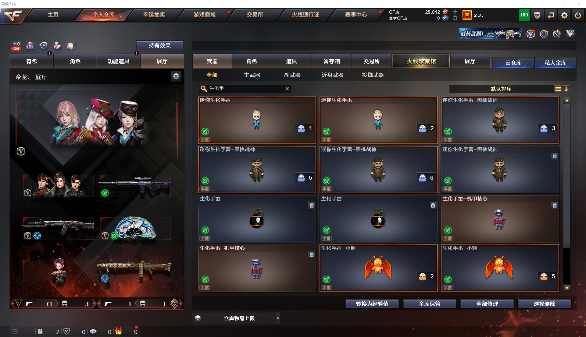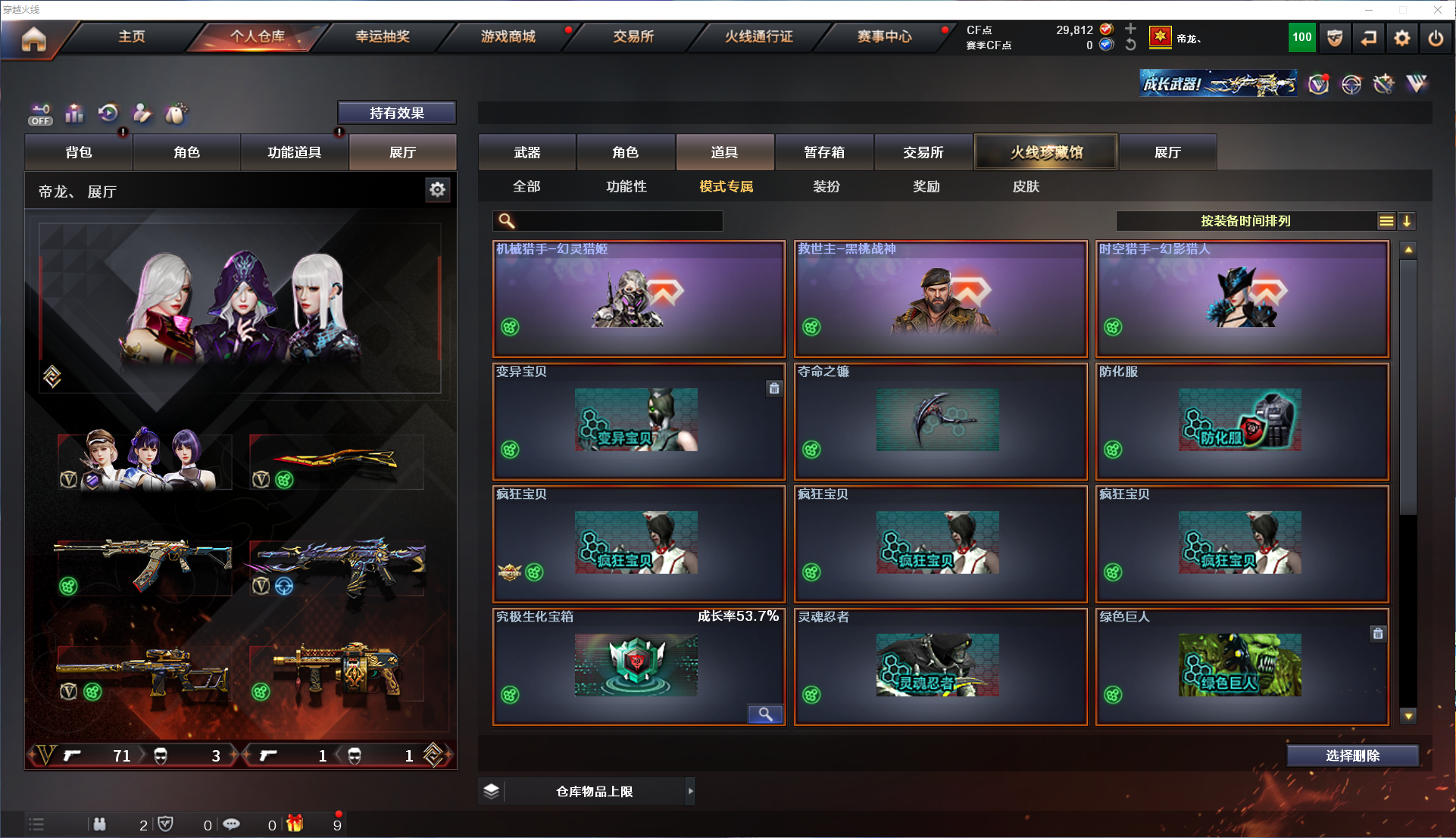 角色:四防传说影煞 4防华 机械姬 雨墨 皮肤:机械猎手-幻灵猎姬 时空猎手-幻影猎手 钢铁终结者-湮灭之柱 武器:满级八面玲珑 “VEPR-12-宇斯” 异变镇魔者 VSK-49-金蚀 传说破晓 炽芒蝶刃 QBZ03-天罚 道具:散弹枪弹夹26/2/1,手枪弹夹26/5/6,步枪弹夹,生化弹夹,防护服 变异宝贝 灵魂忍者 夺命之镰;炽芒蝶刃,传说影煞,QBZ03-金色蔷薇,Scar Light-白虎,