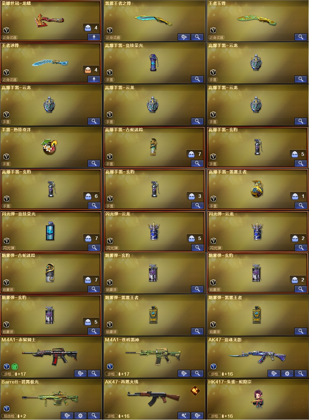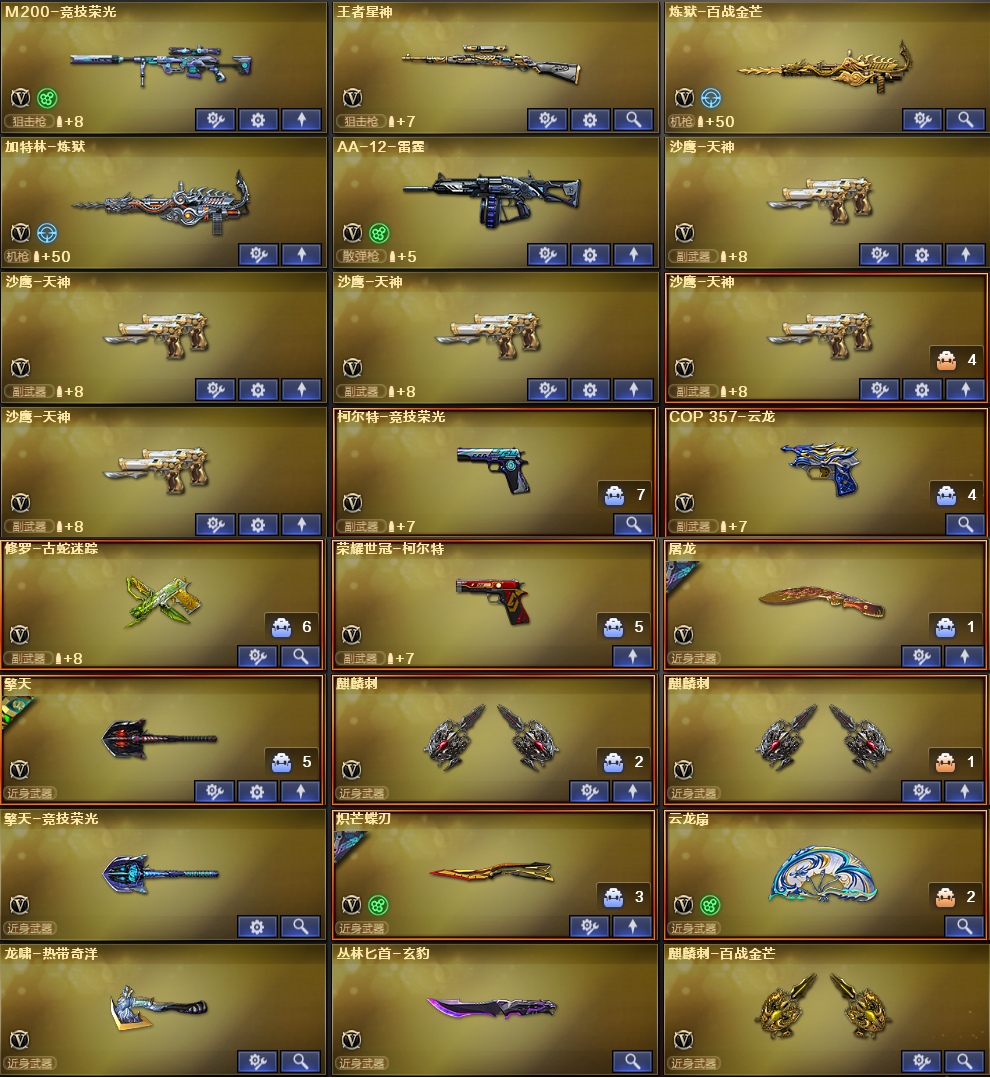 爆破性价比✅四防传说星骇影煞+法玛斯+带皮炽芒✅裁决4件套+QBZ量子蔷薇✅白虎双皮+天罚✅竞技荣光全套 稀有武器:FAMS G2天戎、M200竞技荣光、QBZ金色蔷薇、Scarlight白虎、QBZ天罚、炽芒蝶刃、荣耀世冠柯尔特、柯尔特电竞之星、荣耀世冠火麒麟、荣耀世冠雷神、神工天巧全套、火麒麟、黑龙、雷神X2、黑骑士X2、死神、天启、黑武士锦绣游龙、超新星热带奇洋、金色蔷薇古蛇迷踪、死神雪域霜狐、机械迷城穹宇、玫瑰精灵、9A91烈火、裁决、炼狱百战金芒、炼狱、A12雷霆、天神X2、柯尔特竞技荣光、COP云龙、修罗古蛇迷踪、屠龙、擎天、麒麟刺X2、擎天竞技荣光、云龙扇、龙啸热带奇洋、丛林匕首玄豹、麒麟刺百战金芒、荣耀世冠龙啸、M4赤狱骑士、M4苍鸣雷神、AK竞魂无影、Barrett碧霄极光、黑武士渊龙、黑鲨律动黄昏、天神波塞冬、集束激光-超越6、冰龙粉碎者-白马银枪、KAC青曜、神圣爆裂者-末日3、试炼破坏者3、巡航者、神罚 稀有角色:传说星骇(四防:减少闪光效果+免疫队友炸弹伤害+减少掉落伤害+副武器自动装弹)、传说影煞(四防:生化背包变更+捕食者之眼+生化觉醒狂暴化+佣兵觉醒无需换弹)、电竞教官云悠悠、晴雅、关小雨、华、雾萌萌、玄豹、零纪元、战地猎狐、葵阿尔法武装、奇洋探员、蛇影宗、王者云悠悠、雪域霜狐、炽天使、曙光 音效卡:裁决音效卡、雷神音效卡、炼狱-百战金芒-庆典舞曲音效卡、碧霄极光音效卡、死神-雪域霜狐-怀旧音效卡 稀有皮肤:炽芒蝶刃破浪逐光皮肤、金色蔷薇量子蔷薇皮肤、白虎暗星皮肤/热带奇洋皮肤、裁决典雅胡桃皮肤/流光秘银皮肤/巅峰荣耀皮肤、黑骑士少林皮肤/典雅胡桃皮肤、擎天傲竹皮肤、屠龙破浪逐光皮肤、火麒麟荣耀世冠AG皮肤/传奇EVEN皮肤、雷神传奇N9皮肤/白鲨-CFPLS14冠军皮肤/CFS2019皮肤 王者炫金武器:王者之武觉醒、王者玄武觉醒、王者星神觉醒、王者玉峰雷霆觉醒、雷霆王者之锋觉醒、王者冰峰觉醒、炫金火麒麟、炫金雷神 投掷套装:竞技荣光套、云龙套X4、玄豹套X6、雷霆王者套、手雷热带奇洋、高爆手雷古蛇迷踪、烟雾弹-生日快乐、音乐手雷 小人枪武器特殊武器:HK417蛇影宗、火麒麟零纪元、KAC黑桃战神、黄金猫猫手套-白鲨、COP旗袍、迷你生化手雷X2;荣耀世冠-柯尔特,炽芒蝶刃,传说影煞,传说星骇,电竞教官-云悠悠,晴雅,QBZ03-金色蔷薇,