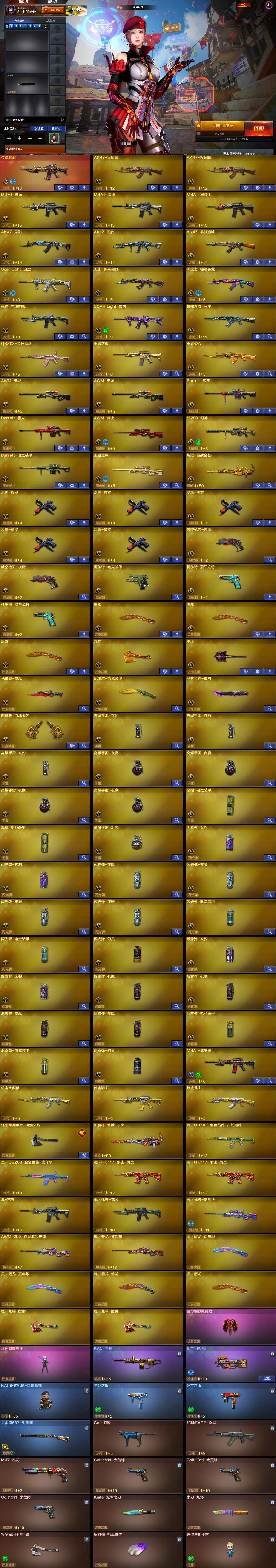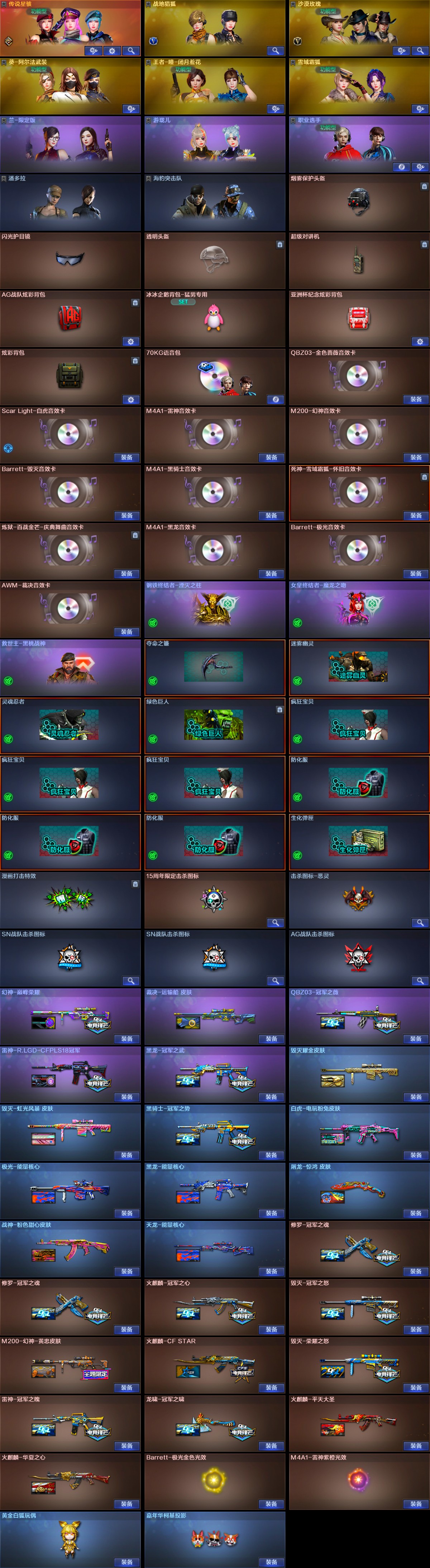 稀有武器】:传说暗裔/M200-幻神/ScarLight-白虎/破空枪刃-夜魔(2)/柯尔特-电竞装甲/柯尔特-冠军之特(2)/QBZ03-金色蔷薇/AK47-火麒麟(2)/M4A1-黑龙/M4A1-雷神/M4A1-黑骑士/AK47-无影/Barrett-毁灭/Barrett-极光/AWM-裁决/Barrett-电竞装甲/马来剑-夜魔/尼泊尔-电竞装甲 【王者武器】:王者之魄-觉醒版/王者之决-觉醒版 【热门角色】:沙漠玫瑰/职业选手/海豹突击队/潘多拉 【热门音效卡】:M200-幻神音效卡/AWM-裁决音效卡/Scar Light-白虎音效卡/QBZ03-金色蔷薇音效卡/M4A1-雷神音效卡/Barrett-毁灭音效卡/M4A1-黑骑士音效卡/M4A1-黑龙音效卡/Barrett-极光音效卡 【热门皮肤】:幻神-巅峰荣耀/雷神-R.LGD-CFPLS18冠军/QBZ03-冠军之薇/黑龙-冠军之武/白虎-电玩粉兔皮肤/火麒麟-冠军之心/毁灭-冠军之怒/毁灭-荣耀之怒/雷神-冠军之魄/龙啸-冠军之啸 【其他亮点】:Knife-冠军之刃/贝雷塔687-射手座 (截图展示段位不代表实际段位,如赛季更新等不可抗拒因素发生变化,其余道具看截图或咨询客服);