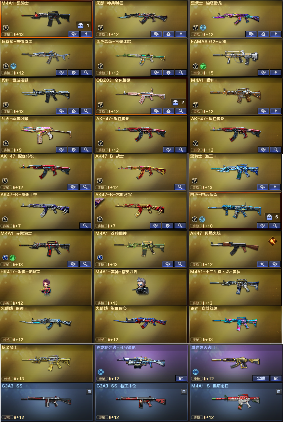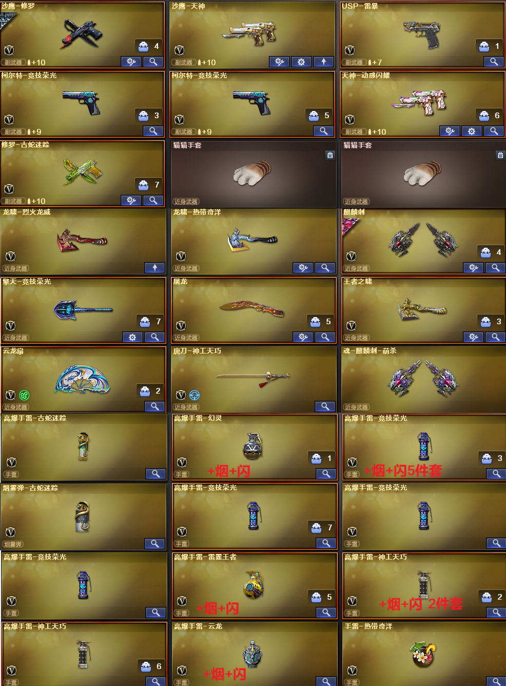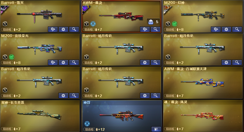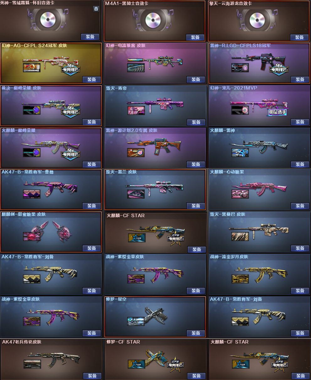 稀有武器:M200幻神、传说圣谕、FAMASG2天戎、M200竞技荣光、裁决、USP雷暴、USP冥王、柯尔特竞技荣光X2、QBZ金色蔷薇、火麒麟、雷神X2、AA12-雷霆、无影神兵利器、黑骑士、雷霆、黑武士锦绣游龙、超新星热带奇洋、金色蔷薇古蛇迷踪、死神雪域霜狐、猎神、烈火动感闪耀、白虎电玩蓝兔、毁灭、暗月传说X3、烈龙、烈龙云海游龙、修罗、天神、天神动感闪耀、修罗古蛇迷踪、屠龙、麒麟刺、擎天竞技荣光、唐刀神工天巧、屠龙动感闪耀、擎天云海游龙、云龙扇、龙啸热带奇洋、龙啸烈火龙威、 稀有角色:传说艾莉莎(四防:减少闪光效果+免疫队友炸弹伤害+减少掉落伤害+副武器自动装弹)、电竞教官云悠悠、战地猎狐、奇洋探员、蛇影宗、雪域霜狐、云海玲珑、0号玩家 音效卡:裁决音效卡、死神雪域霜狐音效卡、黑骑士音效卡、擎天云海游龙音效卡 稀有皮肤:幻神宠儿-2021MVP皮肤AG-CFPLS24冠军皮肤电流骇客皮肤、雷神R.LGD-CFPLS18冠军皮肤源计划2.0专属皮肤、裁决巅峰荣耀皮肤、火麒麟巅峰荣耀皮肤CFSTAR皮肤心动糖果皮肤雷神皮肤、毁灭青帝皮肤墨兰皮肤黑曼巴皮肤、麒麟刺甜蜜糖果皮肤、修罗星空皮肤CFSTAR皮肤 王者炫金武器:王者之啸、王者冰锋、炫金骑士 投掷套装:幻灵套、竞技荣光套、神工天巧套、云龙套、雷霆王者套、玄豹套 小人枪武器特殊武器:HK417朱雀蛇影宗、M4A1雷神精英刀锋、M37葵、猫猫手套、迷你生化手雷;USP-雷暴,炽芒蝶刃,电竞教官-云悠悠,传说艾莉莎,妮妮,QBZ03-金色蔷薇,M200-幻神,