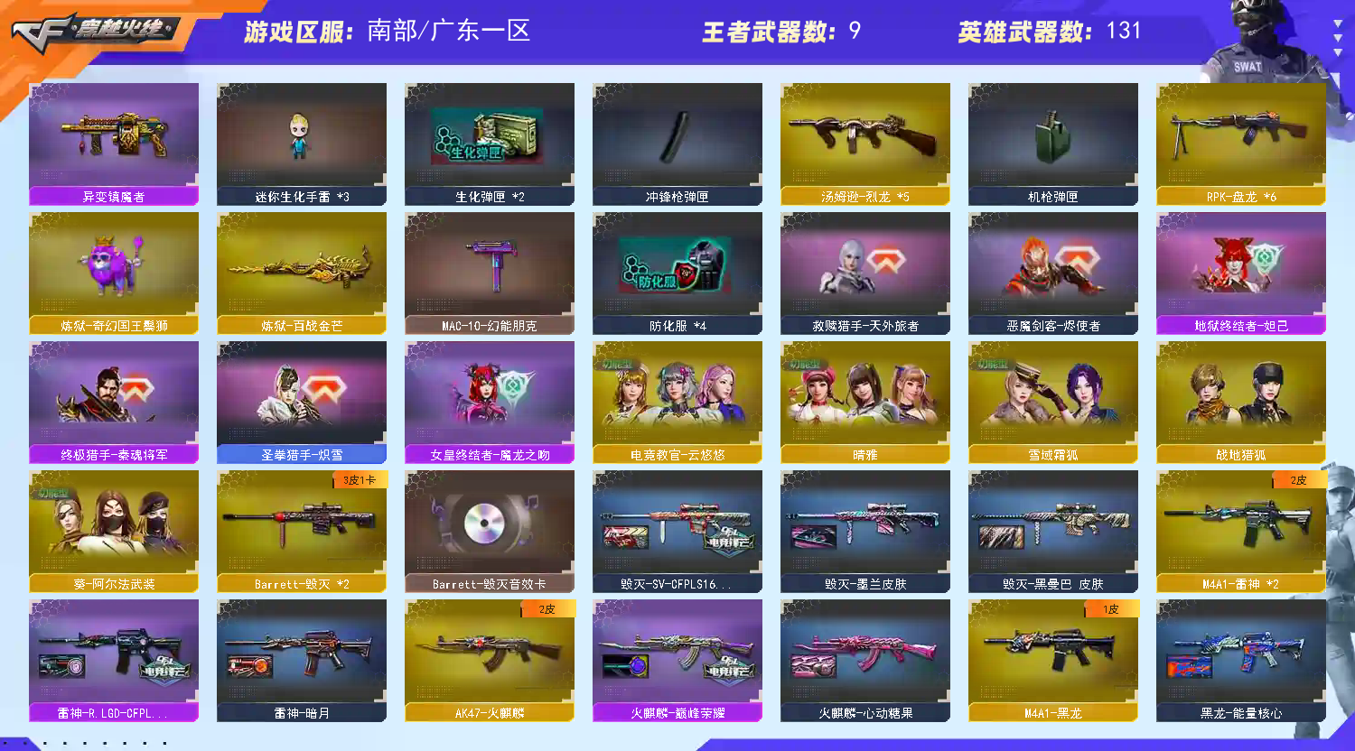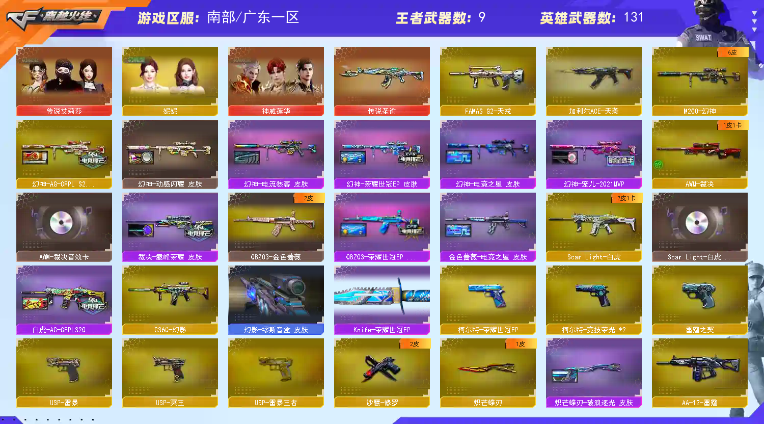 稀有武器:M200幻神、传说圣谕、FAMASG2天戎、烈龙X6+斯泰尔幻面灵狐、盘龙X6+炼狱、炽芒蝶刃、M200竞技荣光、裁决、USP雷暴、USP冥王、柯尔特竞技荣光X2、QBZ金色蔷薇、火麒麟、雷神X2、AA12-雷霆、无影神兵利器、黑骑士、雷霆、黑武士锦绣游龙、超新星热带奇洋、金色蔷薇古蛇迷踪、死神雪域霜狐、猎神、烈火动感闪耀、白虎电玩蓝兔、毁灭、暗月传说X3、烈龙、烈龙云海游龙、修罗、天神、天神动感闪耀、修罗古蛇迷踪、屠龙、麒麟刺、擎天竞技荣光、唐刀神工天巧、屠龙动感闪耀、擎天云海游龙、云龙扇、龙啸热带奇洋、龙啸烈火龙威、 稀有角色:传说艾莉莎(四防:减少闪光效果+免疫队友炸弹伤害+减少掉落伤害+副武器自动装弹)、电竞教官云悠悠、战地猎狐、奇洋探员、蛇影宗、雪域霜狐、云海玲珑、0号玩家 音效卡:裁决音效卡、死神雪域霜狐音效卡、黑骑士音效卡、擎天云海游龙音效卡 稀有皮肤:幻神宠儿-2021MVP皮肤AG-CFPLS24冠军皮肤电流骇客皮肤、雷神R.LGD-CFPLS18冠军皮肤源计划2.0专属皮肤、裁决巅峰荣耀皮肤、火麒麟巅峰荣耀皮肤CFSTAR皮肤心动糖果皮肤雷神皮肤、毁灭青帝皮肤墨兰皮肤黑曼巴皮肤、麒麟刺甜蜜糖果皮肤、修罗星空皮肤CFSTAR皮肤 王者炫金武器:王者之啸、王者冰锋、炫金骑士 投掷套装:幻灵套、竞技荣光套、神工天巧套、云龙套、雷霆王者套、玄豹套 小人枪武器特殊武器:HK417朱雀蛇影宗、M4A1雷神精英刀锋、M37葵、猫猫手套、迷你生化手雷;USP-雷暴,USP-雷暴王者,炽芒蝶刃,电竞教官-云悠悠,晴雅,传说艾莉莎,妮妮,