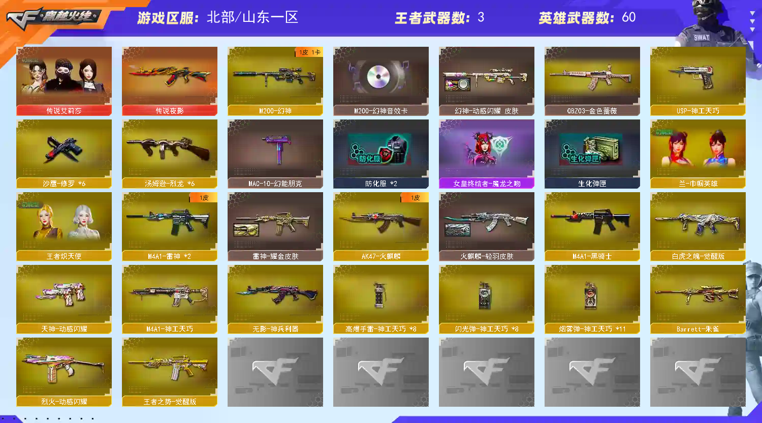 首页 > 租号大厅 > 穿越火线 > 网通区/山东一区 > 幻神+动感闪耀+音效卡+白虎魄神工套夜影+王者炽天使暗夜审判 +传说艾莉莎 兰-巾帼英雄
