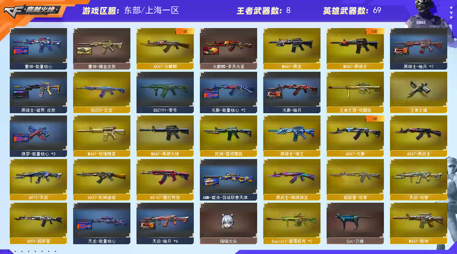 生化: 6烈+斯太尔幻面灵狐+炽芒蝶刃+7生化手雷+3炼狱 爆破:幻神+电流骇客 /双觉醒王者之心+王者之怒 /王者之武 /王者之魂 /天启-悦智 /超新星-悦享 /炫金-修罗 /炫金雷神 /炫金黑龙 /毁灭+音效卡+皮 /雷神+4皮 /黑骑士 /黑龙 /无影 /9A91烈火 /雷霆 /猩红传说 /天启 /机械迷城 /黑武士 /超新星 /天龙 /裁决 /猎神 /玫瑰精灵 /死神-雪域霜狐 /修罗+5 /天神 /海王-黑骑士 /超新星-热带奇洋 /火麒麟+怀旧皮/3QBZ云龙+金色蔷薇+古影迷棕 /满怀旧武器(你想玩的都有) 角色:晴雅+零+樱+战地猎狐 道具:爆破全装/生化全装(6烈+3炼狱);炽芒蝶刃,晴雅,QBZ03-金色蔷薇,M200-幻神,