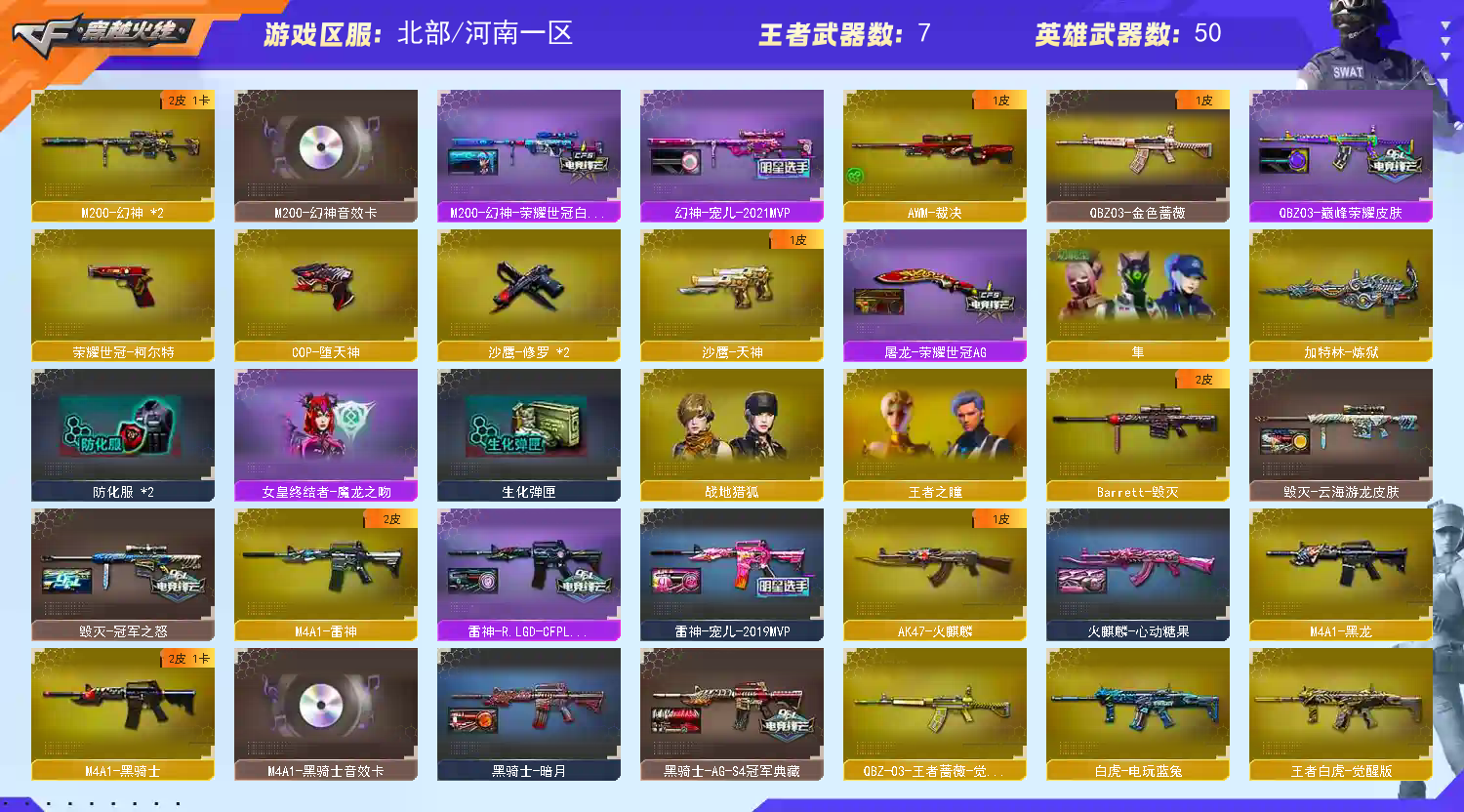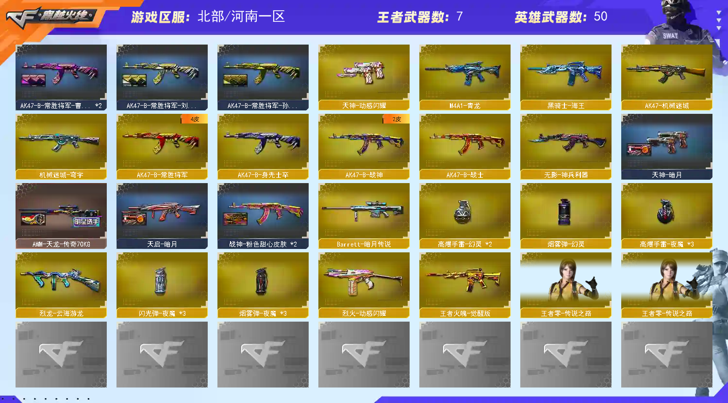 【区服】河南一区【VIP】VIP6【游戏段位】枪王5【游戏等级】Lv.100大元帅【段位排名】472404【CF点】6107【VVIP数量】56【重要套装】【重要角色】隼/蛇姬/王者之瞳/王者零-传说之路/乔伊教练/职业选手/灵狐者-职业经理/女战神/云海玲珑【传说武器】【英雄武器】_M200-幻神(2)/Barrett-毁灭/Barrett-暗月传说/AWM-裁决/M4A1-青龙/M4A1-雷神/M4A1-黑龙/M4A1-黑骑士/黑骑士-海王/白虎-电玩蓝兔/王者白虎-觉醒版/AK47-火麒麟/无影-神兵利器/AK47-机械迷城/AK47-B-身先士卒/AK47-B-常胜将军/AK47-B-战士/AK47-B-战神/QBZ03-金色蔷薇/QBZ-03-王者蔷薇-觉醒版/烈火-动感闪耀/加特林-炼狱/COP-堕天神/天神-动感闪耀/沙鹰-天神/沙鹰-修罗(2)/荣耀世冠-柯尔特/麒麟刺/荣耀世冠-龙啸/王者之啸-觉醒版/屠龙-动感闪耀/屠龙/王者之锋-觉醒版/马来剑-夜魔/手雷-动感闪耀/高爆手雷-幻灵(2)/高爆手雷-夜魔(3)/烟雾弹-幻灵/烟雾弹-夜魔(3)/闪光弹-夜魔(3)/王者火魄-觉醒版/烈龙-云海游龙/擎天-云海游龙/龙啸-烈火龙威/手雷-云海游龙【王者武器】【小人枪】AWM-灵狐-15周年嘉年华/毁灭-孙三炮/夺魂/魔能飞环-曼陀罗/迷你牛牛/闪光弹-小乔/高爆手雷-大乔/闪光弹-貂蝉/灵狐娃娃手雷【其他重要武器】炫金修罗/黑武士-能量核心/AK47-冰龙粉碎者/激光毁灭者III/AK47-烛龙/红龙AK47/AK-47-红龙/AK47-破空冰刃(2)/M4A1-紫狱(3)/AK47-丹龙/AK47-死亡之翼/AK47-盛典-CFS2022/AK47-苍龙/M4A1-秘银赤龙(4)/M4A1-SS-枪王排位/AK-47-二次元(3)/M4A1-S-火种/AN94-青花瓷/AK47-齐天大圣/M4CQBR-AP-孔明/AK47-情人节2021/梦-雷神-快手/Scar-Light-赤血龙魂/M4A1-S-十周年/海浪AK47浏览器/9A-91-圣诞/HK417-红龙/QBZ03-吕布/M4A1-排位(5)/胜利奖杯闪光弹-枪王排位/胜利奖杯烟雾弹-枪王排位【重要武器皮肤】M200-幻神-荣耀世冠白鲨/幻神-宠儿-2021MVP/毁灭-冠军之怒/毁灭-云海游龙皮肤/极光-能量核心/AWM-天龙-传奇70KG/AWM-天龙-传奇白鲨/天龙-CFSTAR/火麒麟-CFSTAR/火麒麟-心动糖果/无影-暗月/AK47-B-常胜将军-刘备/AK47-B-常胜将军-孙权/AK47-B-常胜将军-曹操/M4A1-千变-孔明皮肤/雷神-R.LGD-CFPLS18冠军/雷神-宠儿-2019MVP/黑骑士-AG-S4冠军典藏/黑骑士-暗月/QBZ03-巅峰荣耀皮肤/天启-暗月/战神-粉色甜心皮肤/炼狱-月皮肤/修罗-CFSTAR/天神-暗月/麒麟刺-月皮肤/屠龙-荣耀世冠AG/擎天-冠军之击【重要光效】AN94-超新星蓝色光效/AWM-天龙蓝色光效/RPK-盘龙蓝色光效/加特林-炼狱蓝色光效/巴雷特-毁灭蓝色光效/汤姆逊-烈龙蓝色光效/M4A1-雷神蓝粉色光效【重要音效卡】烈火-动感闪耀音效卡/M200-幻神音效卡/M4A1-黑骑士音效卡【重要戒指】15周年限定戒指/龙眼(死神)/龙眼(鹰)/20赛季纪念戒指-耀金/21赛季纪念戒指-耀铜(食指)/21赛季纪念戒指-耀银(拇指)/22赛季纪念戒指-耀银(拇指)/23赛季纪念戒指-耀铜(食指)/23赛季纪念戒指-耀银(拇指)/24赛季纪念戒指-耀铜(食指)/24赛季纪念戒指-耀银(拇指)/25赛季纪念戒指-耀银(食指)/25赛季纪念戒指-耀银(拇指)/26赛季纪念戒指-耀金(拇指);荣耀世冠-柯尔特,Knife-冠军之刃,隼,QBZ03-金色蔷薇,M200-幻神,