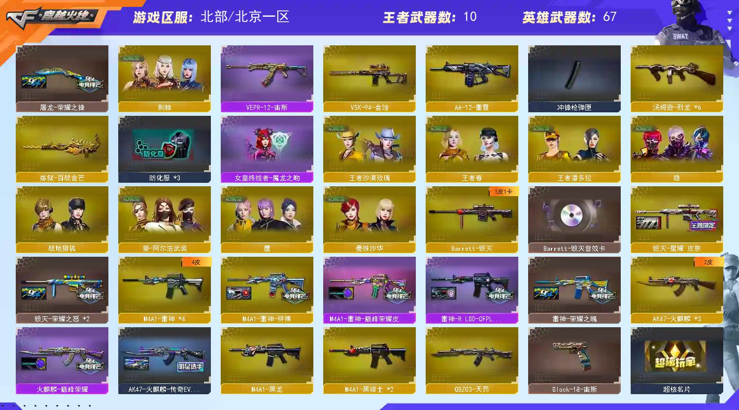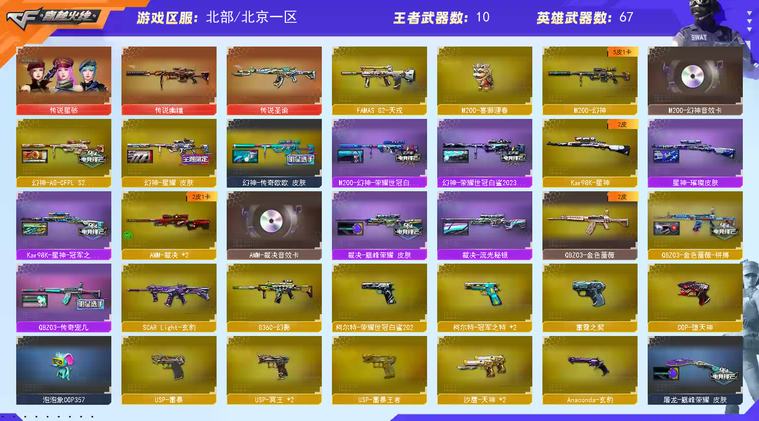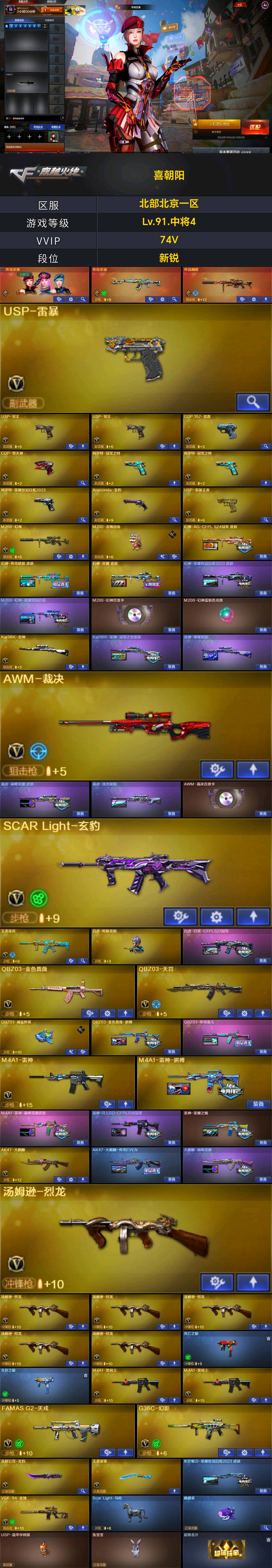 北京一区传说幽瞳/M200-幻神/Kar98K-星神/VSK-94-金蚀/G36C-幻影/QBZ03-天罚/雷霆之契/USP-雷暴/COP-堕天神/柯尔特-荣耀世冠白鲨2023/修罗-古蛇迷踪/柯尔特-冠军之特(2)/金色蔷薇-古蛇迷踪/QBZ03-金色蔷薇/AK47-火麒麟(3)/M4A1-黑龙/M4A1-雷神(4)/M4A1-黑骑士(2)/Barrett-毁灭/AWM-裁决(2)/汤姆逊-烈龙(6)/AA-12-雷霆 【王者武器】: 【热门角色】:曼珠沙华/隐/鹰/蛇隐宗/王者春/王者潘多拉/王者沙漠玫瑰/潘多拉 【热门音效卡】:M200-幻神音效卡/AWM-裁决音效卡/QBZ03-天罚音效卡/Barrett-毁灭音效卡 【热门皮肤】:幻神-AG-CFPLS24冠军皮肤/幻神-传奇欧欧皮肤/幻神-星耀皮肤/幻神-荣耀世冠白鲨2023皮肤/M200-幻神-荣耀世冠白鲨/白虎-白鲨-CFPLS23冠军/裁决-巅峰荣耀皮肤/龙啸-巅峰荣耀皮肤(2)/毁灭-星耀皮肤/QBZ03-传奇宠儿/M4A1-雷神-巅峰荣耀皮肤/Kar98K-星神-冠军之星皮肤/雷神-R.LGD-CFPLS18冠军/火麒麟-巅峰荣耀/星神-璀璨皮肤/裁决-流光秘银/屠龙-巅峰荣耀皮肤/AK47-火麒麟-传奇EVEN/炽芒蝶刃-荣耀世冠白鲨2023皮肤/屠龙-荣耀之锋/毁灭-荣耀之怒(2)/雷神-荣耀之魄 【其他亮点】:白虎-枪娘安妮/M200-喜狮迎春/宙斯权杖/Scar Light-马枪/M14EBR-冠军金牛/Glock-18-宙斯/USP-嘉年华柯基/兔宝宝/烟雾弹-荣耀世冠白鲨2023/超核名片 (截图展示段位不代表实际段位,如赛季更新等不可抗拒因素发生变化,其余道具看截图或咨询客服);USP-雷暴,USP-雷暴王者,柯尔特-荣耀世冠白鲨2023,柯尔特-冠军之特,传说星骇,王者沙漠玫瑰,QBZ03-金色蔷薇,