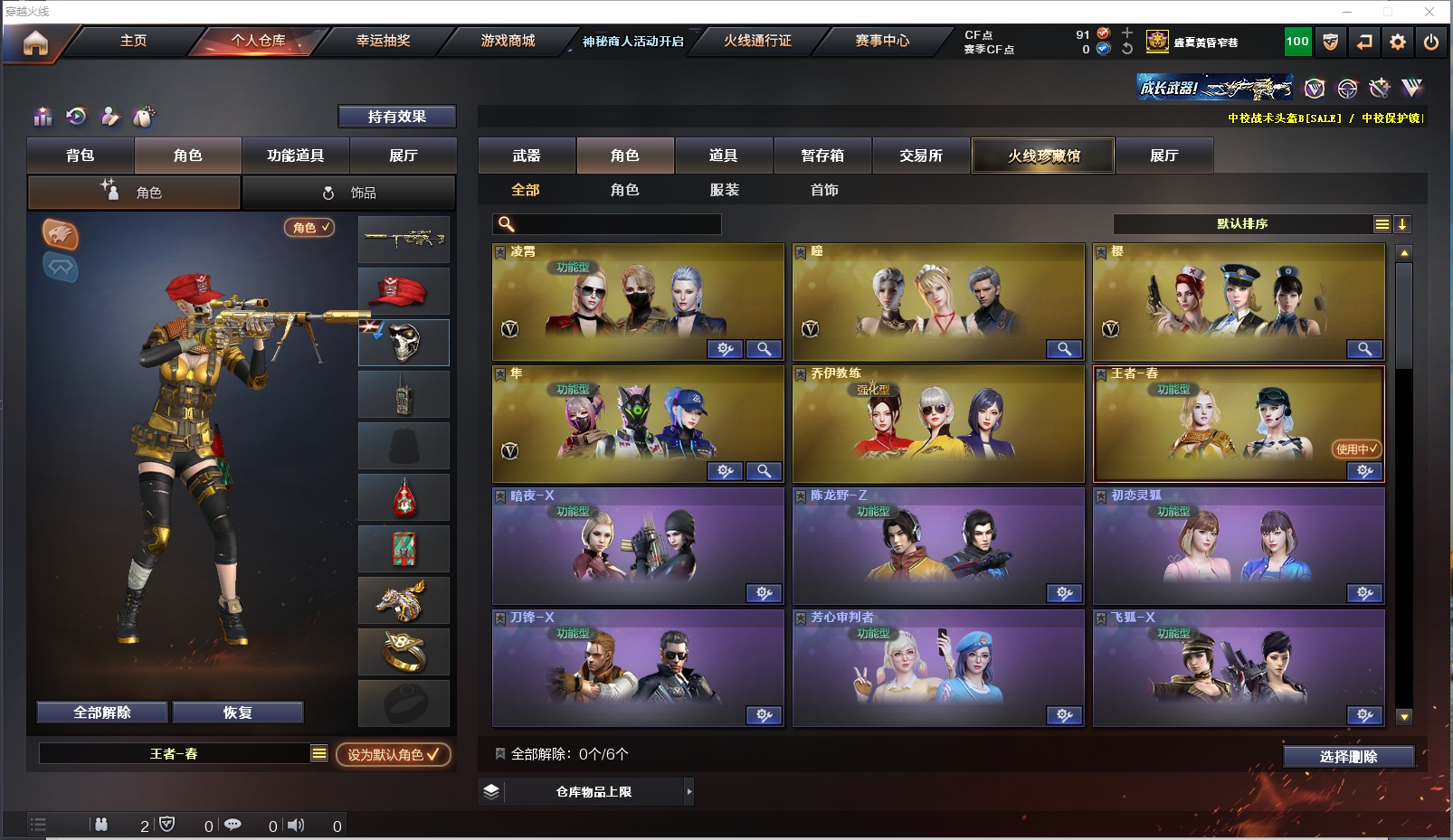 传说光耀|王者幻神|6烈斯太尔蝴蝶6盘炼狱生化角色隼|Scar白虎夜魔|USP雷暴|3音效|生化爆破全装 西部战区合区大区(四川一区、四川二区、重庆一区、陕西一区、**南一区)登录的时候选择陕西一区。 【编号】:SX213 【角 色】:凌霄、瞳、樱、隼、王者春、风暴女、救世主-X、蜀雪、铁骑荣耀、影舞者-X、8周年戒指、双蛇戒指、双龙戒指 【主 武】:传说光耀、王者幻神、6烈蝴蝶、6盘炼狱、白虎、夜魔、火麒麟X2(大唐荣耀)、黑龙、雷神(虎将)、黑骑士X5、无影、天启、武圣、机械迷城、龙血、烈火、QB金色蔷薇、黑武士网剧、天龙、毁灭(星空)、裁决、暗月传说、毁灭征服者、机甲撕裂者、激光毁灭者、圣炎切割者、深渊巨龙咆哮、神圣爆裂者、试炼破坏者、苍雷、金魔等各种活动武器 【副 武】:修罗X5(STAR、星空)、天神X2、USP雷暴、武圣、破空枪刃夜魔X2、柯尔特电竞装甲、天神动感闪耀、王者之灵X2、天神网剧、阐释者、COP小青龙、胜利之火、大黄蜂 【近 身】:屠龙X2(荣耀之锋)、龙啸X2、擎天X2、麒麟刺X3、斩神刀雷暴、麒麟刺堕天神、马来剑夜魔、幻灵之锋、擎天网剧、丛林匕首-枪王排位、猫猫手套、激光短刃、冰火魔拳 【投 掷】:雷暴套装X3、堕天神套装、夜魔套装X7、电竞装甲套装、深渊终结者手雷、胜利之光、高爆手雷-雷蛇、高爆手雷-SS 【道 具】:黑骑士音效卡、毁灭音效卡、雷神音效卡、地狱终结者玩偶、深渊红龙玩偶、幸运牛仔玩偶、三国蜀国玩偶、7个背包、AC(防弹衣+防弹头盔)、C4工具钳、手雷包、挑战弹夹、夺命之镰、变异宝贝、灵魂忍者、生化弹夹、防化服、机枪弹夹、冲锋枪弹夹、散弹枪;USP-雷暴,隼,RPK-盘龙,QBZ03-金色蔷薇,Scar Light-白虎,