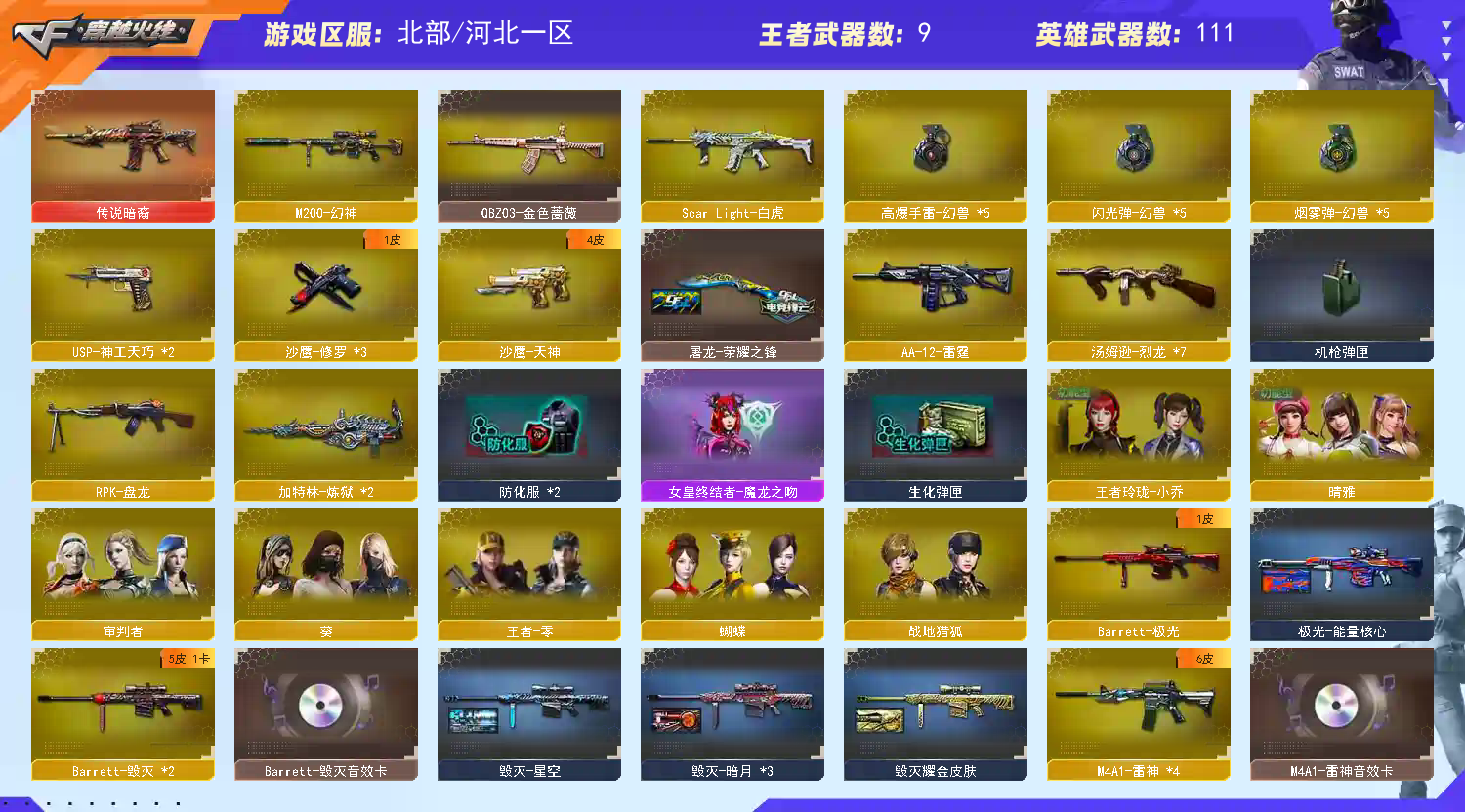 121v 晴雅✨蝴蝶✨暗夜审判❤幻神❤USP-神工天巧*2❤炽芒蝶刃❤传说暗裔❤白虎/白虎-电玩/6烈龙/金色蔷薇/小乔/海滩派对/水下丽影/职业选手(70KG语音包)/毁灭-耀金/雷神-宇航兔/火麒麟-STAR/黑骑士-耀金/6音效卡/Vip6/二字ID等;炽芒蝶刃,晴雅,RPK-盘龙,QBZ03-金色蔷薇,M200-幻神,Scar Light-白虎,传说暗裔,