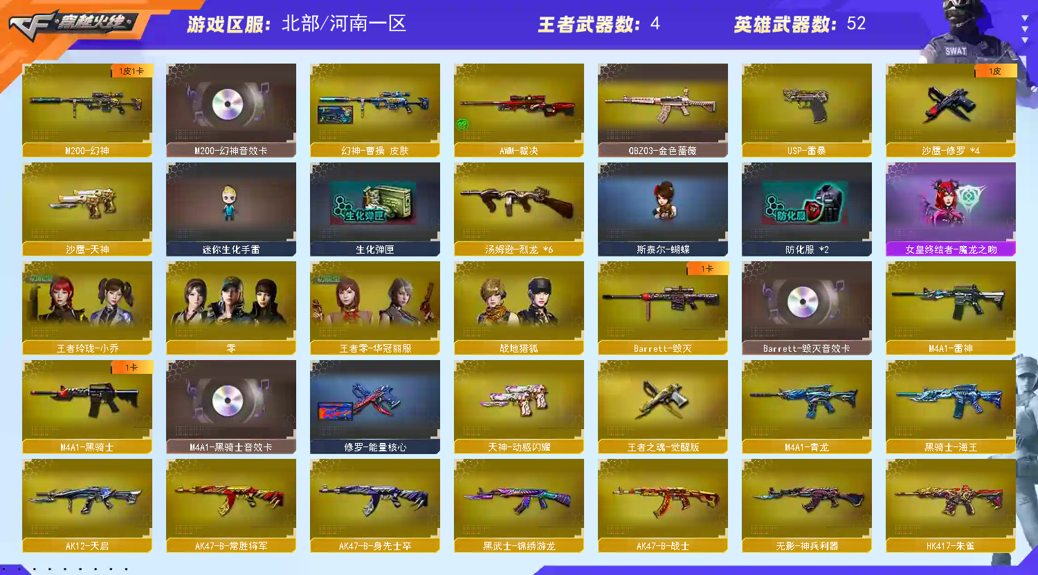 【幻神曹操+幻神音效卡☀星神炽天使☀qbz金色蔷薇朱雀青龙usp雷暴蝴蝶6烈不换弹四防王者小乔☀】 【荣耀之巅】【Lv.100 大元帅】VIP4 55V 4王者 2炫金 幻神曹操 /毁灭青帝/天龙秘银/火麒麟CFSTAR/修罗能量核心/_零/M200-幻神/Barrett-毁灭/AWM-裁决/M4A1-青龙/M4A1-雷神/M;USP-雷暴,QBZ03-金色蔷薇,M200-幻神,