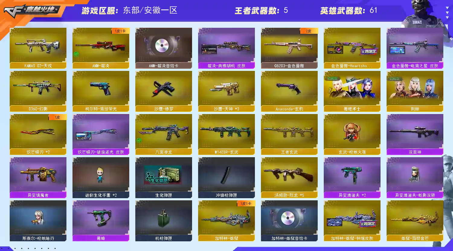 四防云悠悠岚兮儿荆棘毒蝰术士迅捷虹喵枪娘樱玄豹王者晴雅(爆破) 炼狱音效卡钟馗皮肤,裁决音效卡典雅胡桃皮肤 时空猎手幻影猎人皮肤 有两把玄武,一个普通英雄级的,一个王者的;炽芒蝶刃,电竞教官-云悠悠,QBZ03-金色蔷薇,G36C-幻影,