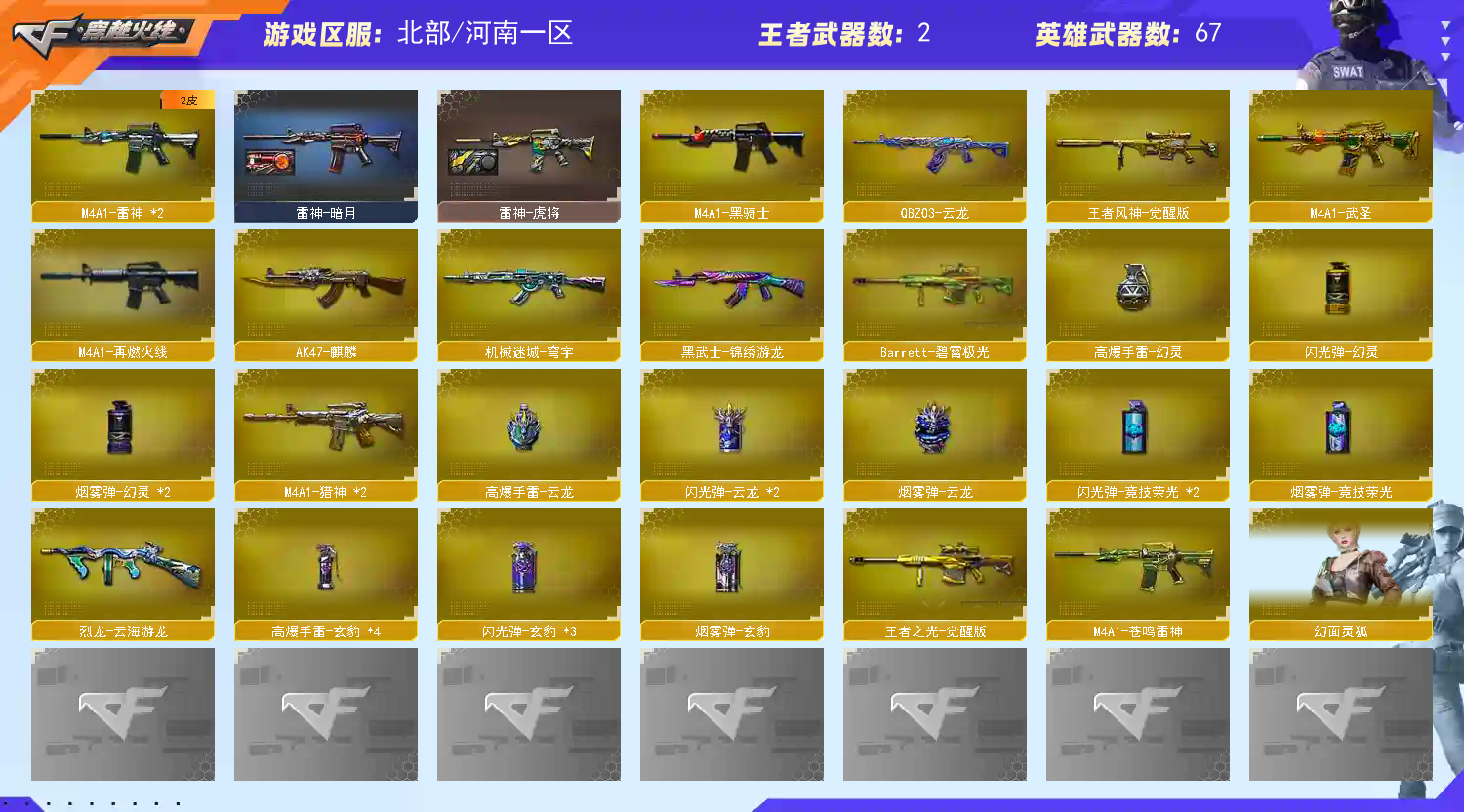 禁止开挂 【传说武器】传说梦魇/传说灵眸 【英雄武器】_M200-幻神/Barrett-毁灭/王者之光-觉醒版/AWM-裁决/M4A1-雷神(2)/M4A1-黑骑士/M4A1-武圣/M4A1-猎神(2)/AK47-麒麟/QBZ03-云龙/QBZ03-金色蔷薇/RPK-盘龙/汤姆逊-烈龙(5)/加特林-炼狱(2)/沙鹰-天神/Glock18-武圣/麒麟刺/龙啸/屠龙/炽芒蝶刃/高爆手雷-云龙/高爆手雷-幻灵/烟雾弹-云龙/烟雾弹-幻灵(2)/烟雾弹-竞技荣光/闪光弹-云龙(2)/闪光弹-幻灵/闪光弹-竞技荣光(2)/HK417-朱雀-电竞之星/M4A1-苍鸣雷神/机械迷城-穹宇/黑武士-锦绣游龙/G36C-幻影/Barrett-碧霄极光/VSK-94-金蚀/王者风神-觉醒版/炼狱-百战金芒/烈龙-云海游龙/修罗-云海游龙/屠龙-电竞之星/麒麟刺-百战金芒/龙啸-热带奇洋/擎天-云海游龙/龙啸-烈火龙威/闪光弹-玄豹(3)/高爆手雷-玄豹(4)/烟雾弹-玄豹/手雷-热带奇洋/手雷-云海游龙 【王者武器】 【小人枪】火麒麟-零·纪元(2)/AWM-灵狐-15周年嘉年华(4)/裁决-雪莉杨/KAC锯式机枪-黑桃战神/异变清道夫-蛇影双骄/斯泰尔-枪娘暗刃(2)/斯泰尔-蝴蝶/沙鹰-夜玫瑰/迷你深渊冰龙/迷你曼提柯尔/迷你火种/小飞碟-宇航兔兔(2)/迷你救赎猎手(2)/迷你白狐(2)/迷你裂空之翼(2)/迷你波特博士/魔能飞环-曼陀罗;炽芒蝶刃,隼,RPK-盘龙,QBZ03-金色蔷薇,G36C-幻影,M200-幻神,传说灵眸,