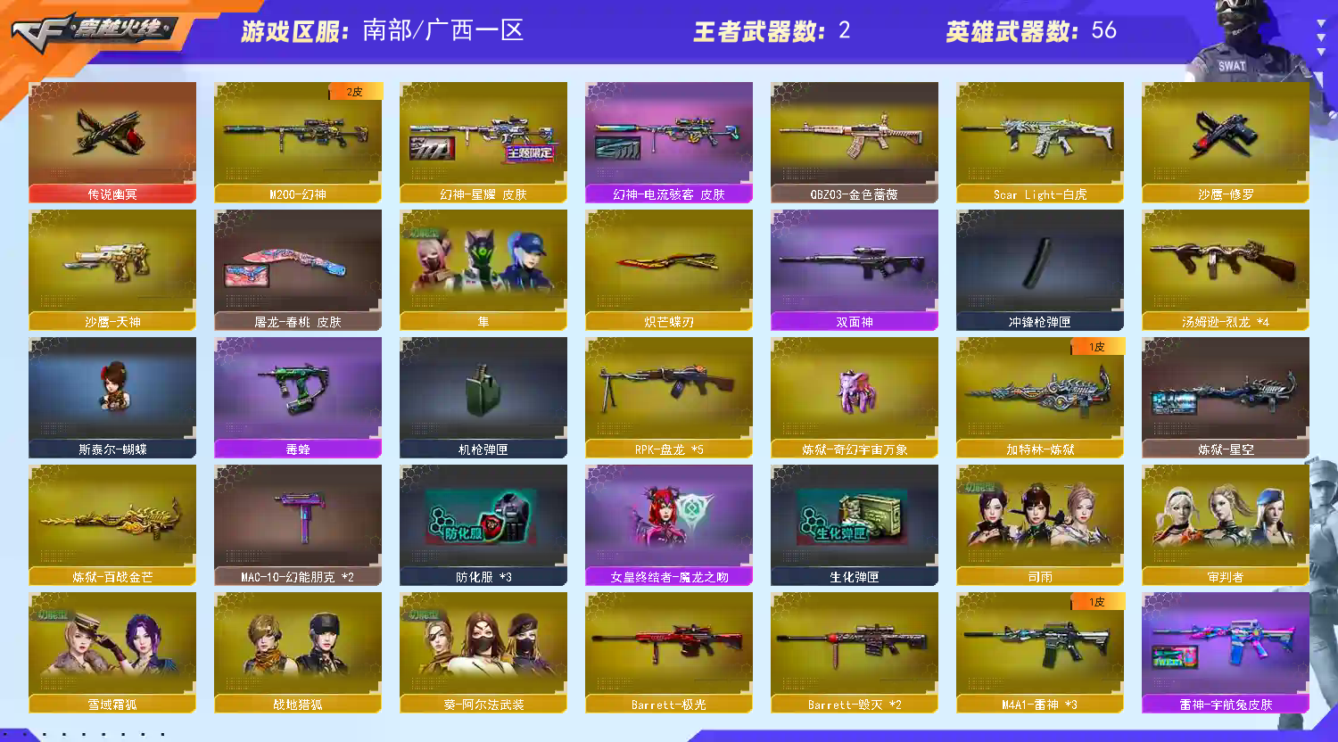 南部战区 涵盖江西一区、湖北一区、广东二区、南方大区、湖北二区、广东三区、湖南一区、广东一区、广东四区、湖南二区、广西一区。;传说幽冥,炽芒蝶刃,隼,RPK-盘龙,QBZ03-金色蔷薇,M200-幻神,Scar Light-白虎,