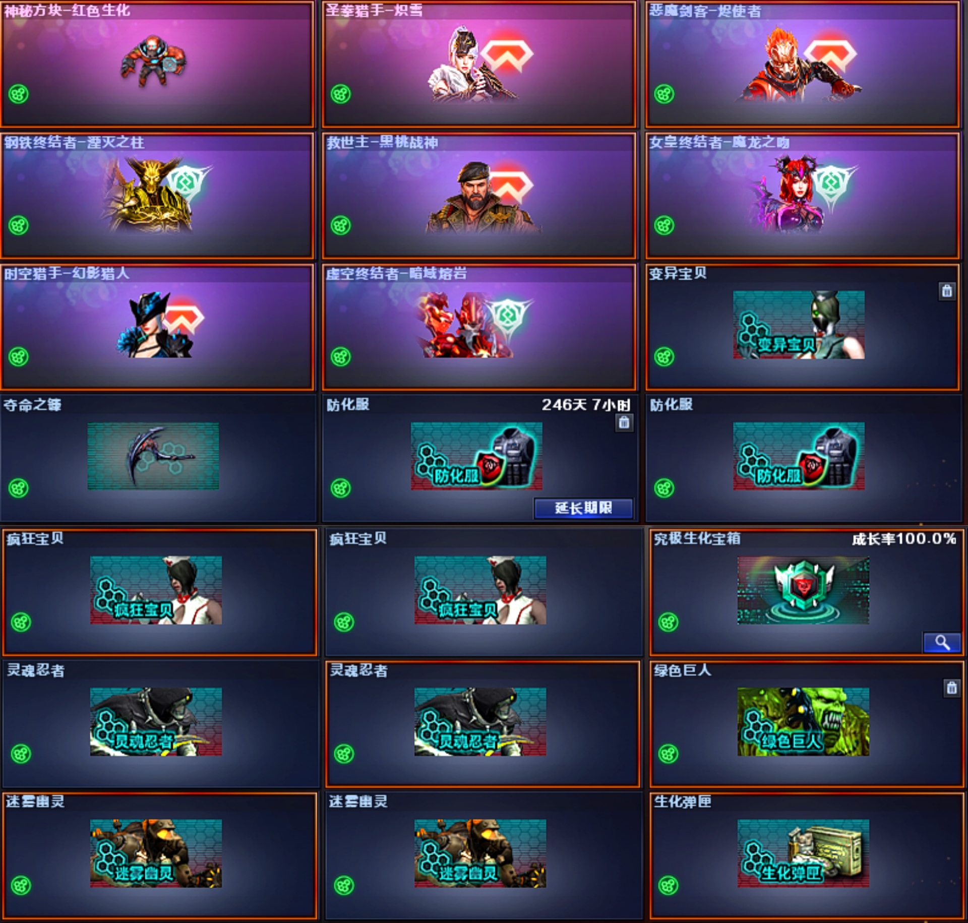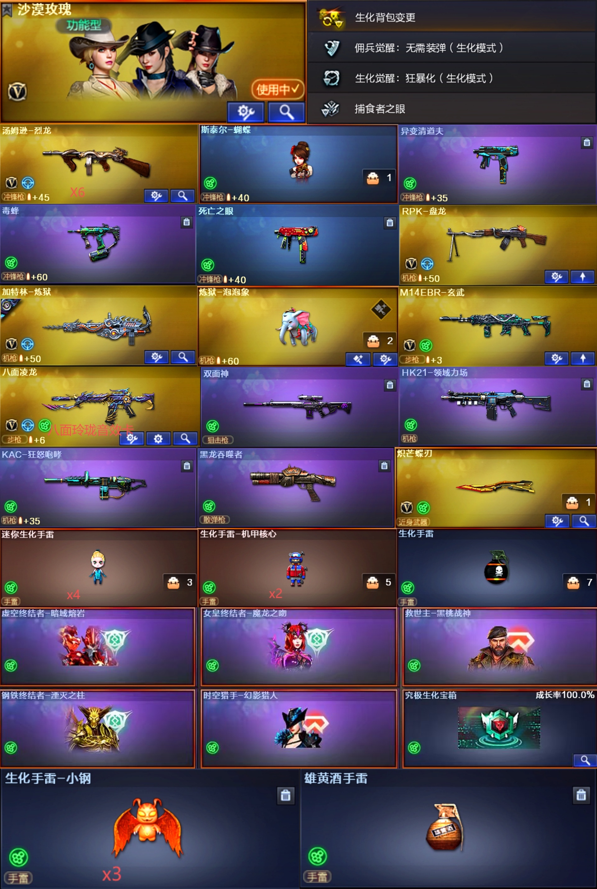 沙漠玫瑰 蓝泡泡象 6烈龙 斯泰尔蝴蝶 毒蜂 玄武 满级八面玲珑带卡 双面神 炽芒蝶刃可爆破生化挑战