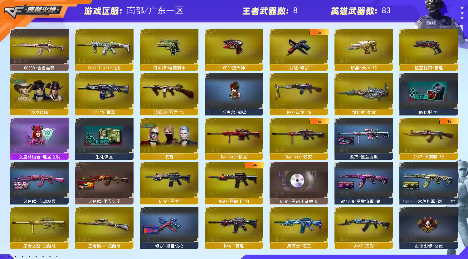 首页 > 租号大厅 > 穿越火线 > 电信区/广东一区 > 极品爆破生化挑战 王者星神+堕天神cop+qbz+白虎+六列蝴蝶+六盘炼狱生化角色沙漠玫瑰+满雷+全