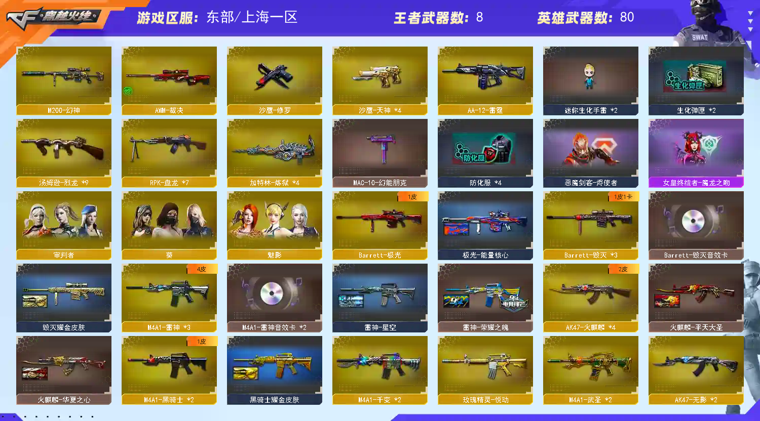 禁止开外挂和与外挂组队排位,禁止使用鼠标宏以及任何非官方辅助插件;造成账号封禁必追究法律责任。文明游戏切勿开G,请勿以身试法。游戏账号属于个人财产,受到法律保护(按照充值金额赔偿),如有造成损失,必究!!! 注意!!!租号必看!!!! 喜欢的租友可以点进收藏,回头再来! 为方便他人和自己下一次租号,打排位时请一定不要退赛,频繁退赛则会导致排位禁赛,若经发现一律拉黑,也请广大租友手下留情。 此号性价比最耐打,同价位找不出比这个号质量更高的!期望大家回头再来。 因为排位有可能禁赛,大家也可以选择打打生化或者挑战,都是满配。 武器装备看图和简介 开始登录游戏时不要动鼠标,静等一两分钟,多次登录不上就选择(F9)账号密码登录即可! 登录不上请耐心多尝试几次 登号时别动鼠标 登录不上请耐心多尝试几次 登号时别动鼠标 登录不上请耐心多尝试几次 登号时别动鼠标 由于异地登录保护机制,部分客户在使用客户端自动上号时会出现密码错误,注意本号密码不会错误,请多尝试5-6次! 多四防角色,各种皮肤武器光效玩偶道具,欢迎来体验!武器太多,截不了那么多图!【此号全部装备太多截不了太多图,还有很多神器未截图,普通CF点武器也是一百多个就不截图了(满背包满道具爆破、生化、挑战武器应有尽有多个玩偶主流武器多光效),主流枪械都有皮肤】 【请租客爱护此号,当成自己号玩,喜欢请收藏,小店将十分感谢!烦请各位大佬快到时间不要开排位啦,可以打匹配,如需要续费请在订单结束十分钟前续时,不要等时间结束了都不知道。谢谢各位!祝大家玩的开心!】 有什么问题请填写真实理由【不要无故撤单】否则拉黑,订单时间快到了禁止再开排位赛,本店将永久拉黑【恶意撤单/排位掉线】的不文明租客 有什么问题请填写真实理由【不要无故撤单】否则拉黑,订单时间快到了禁止再开排位赛,本店将永久拉黑【恶意撤单/排位掉线】的不文明租客 有什么问题请填写真实理由【不要无故撤单】否则拉黑,订单时间快到了禁止再开排位赛,本店将永久拉黑【恶意撤单/排位掉线】的不文明租客 有什么问题请填写真实理由【不要无故撤单】否则拉黑,订单时间快到了禁止再开排位赛,本店将永久拉黑【恶意撤单/排位掉线】的不文明租客;RPK-盘龙,M200-幻神,