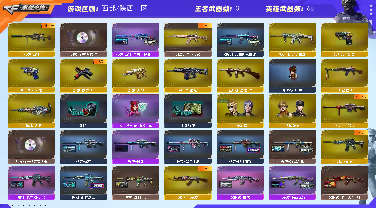 幻神荣耀世冠白鲨2023/幻神N9/毁灭荣耀之怒/火麒麟CFSTAR/雷神刘备/雷神白鲨/雷神荣耀之魄/黑龙暗月/金色蔷薇秘岩封印/战神紫绶金章/_瞳/_迷迭香/蛇隐宗/蛇姬/M200-幻神/Barrett-毁灭(2)/Barrett-极光/Barrett-暗月传说/M4A1-雷神(2)/M200-幻神音效卡/修罗-古蛇迷踪音效卡;RPK-盘龙,QBZ03-金色蔷薇,M200-幻神,Scar Light-白虎,