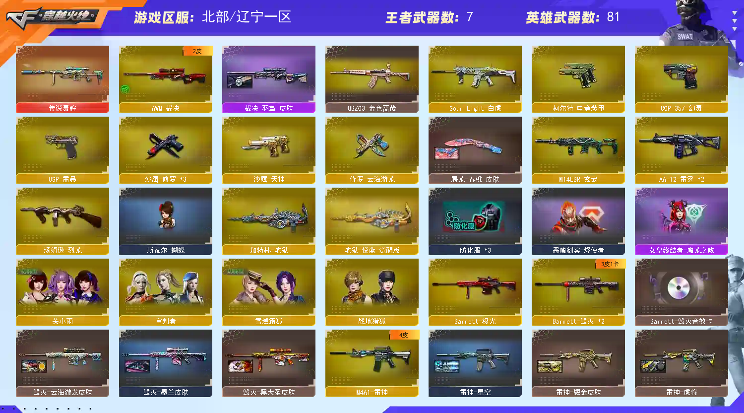 传说灵眸。USP雷暴COP幻灵。王者星神。白虎QBZ。雷神荣耀。毁灭三件套。关小雨。裁决